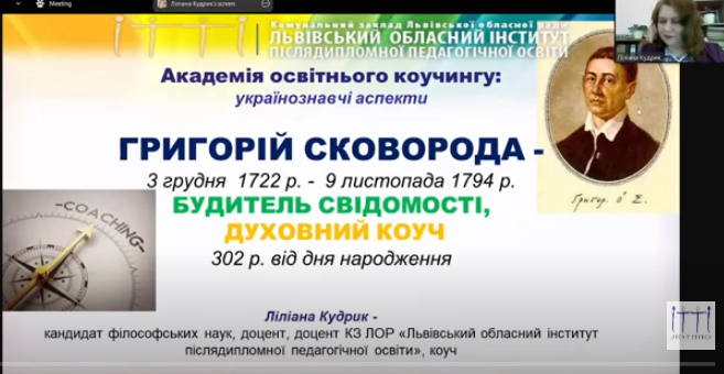 Ліліана Кудрик, доцентка кафедри суспільствознавчої освіти КЗ ЛОР «Львівський обласний інститут післядипломної педагогічної освіти», кандидатка філософських наук, доцентка, охарактеризувала особливості духовного коучингу як напряму особистісного вдосконалення, що спрямований на здобуття людиною цілісності і внутрішньої гармонії, та його завдання; обґрунтувала характеристики духовного коуча, носіями яких повною мірою є Григорій Сковорода, який зумів прожити так, як учив. Через філософські трактати, вірші-пісні, байки, притчі, за допомогою усної проповіді Григорій Сковорода навчав тих, хто хотів навчатися, ішов туди, де на нього чекали, де потребували його мудрого слова. Як коуч-наставник він через бесіду, діалог намагався розкрити внутрішню мудрість людини, її серце, навчити думати. Осмислення творчої спадщини і багатогранної постаті українського генія і сьогодні допомагає пізнавати свій народ і в народі себе; через «сродну» працю проявляти свій творчий потенціал і бути щасливими, реалізованими, корисними для суспільства.