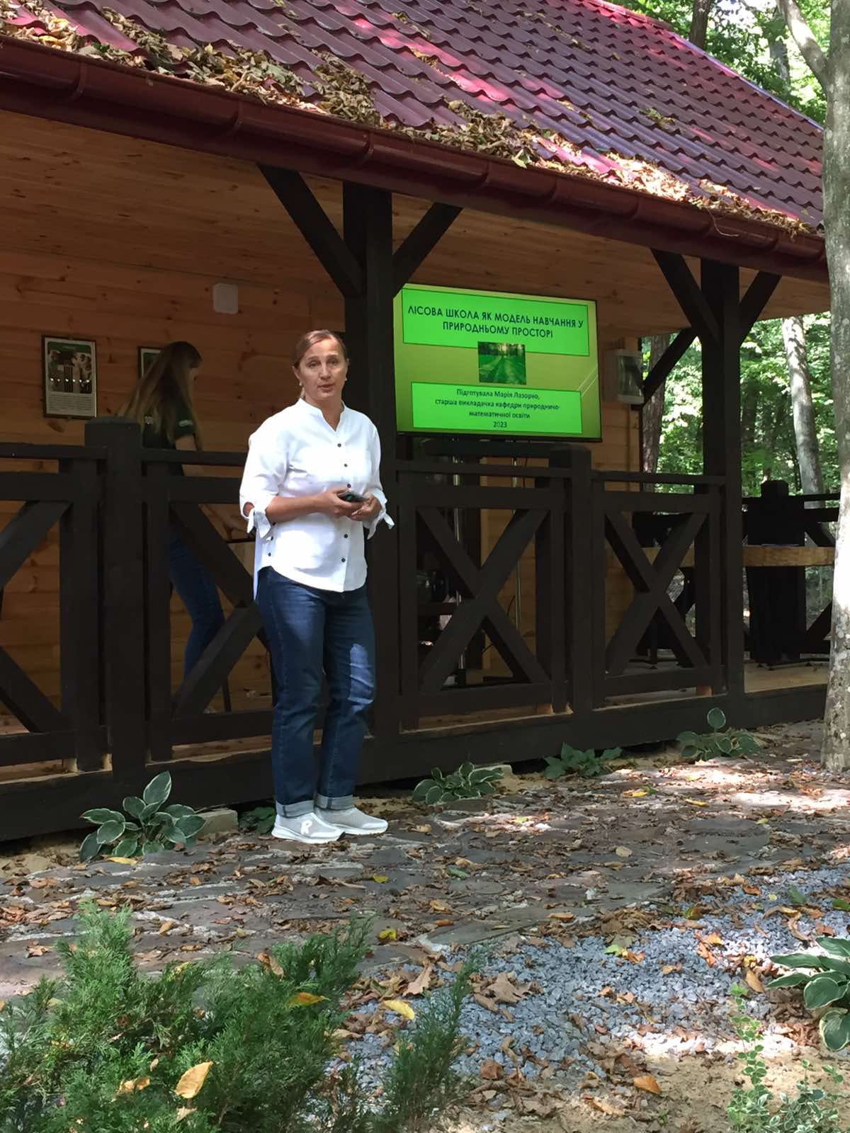 Марія Лазорко ознайомила учасників з моделями навчання у природному просторі, різновидами уроків серед природи, запропонувала інтерактивні вправи, «пригодницькі запитання», лісовий журнал для лісових уроків, дидактичні ігри для уроків серед природи.