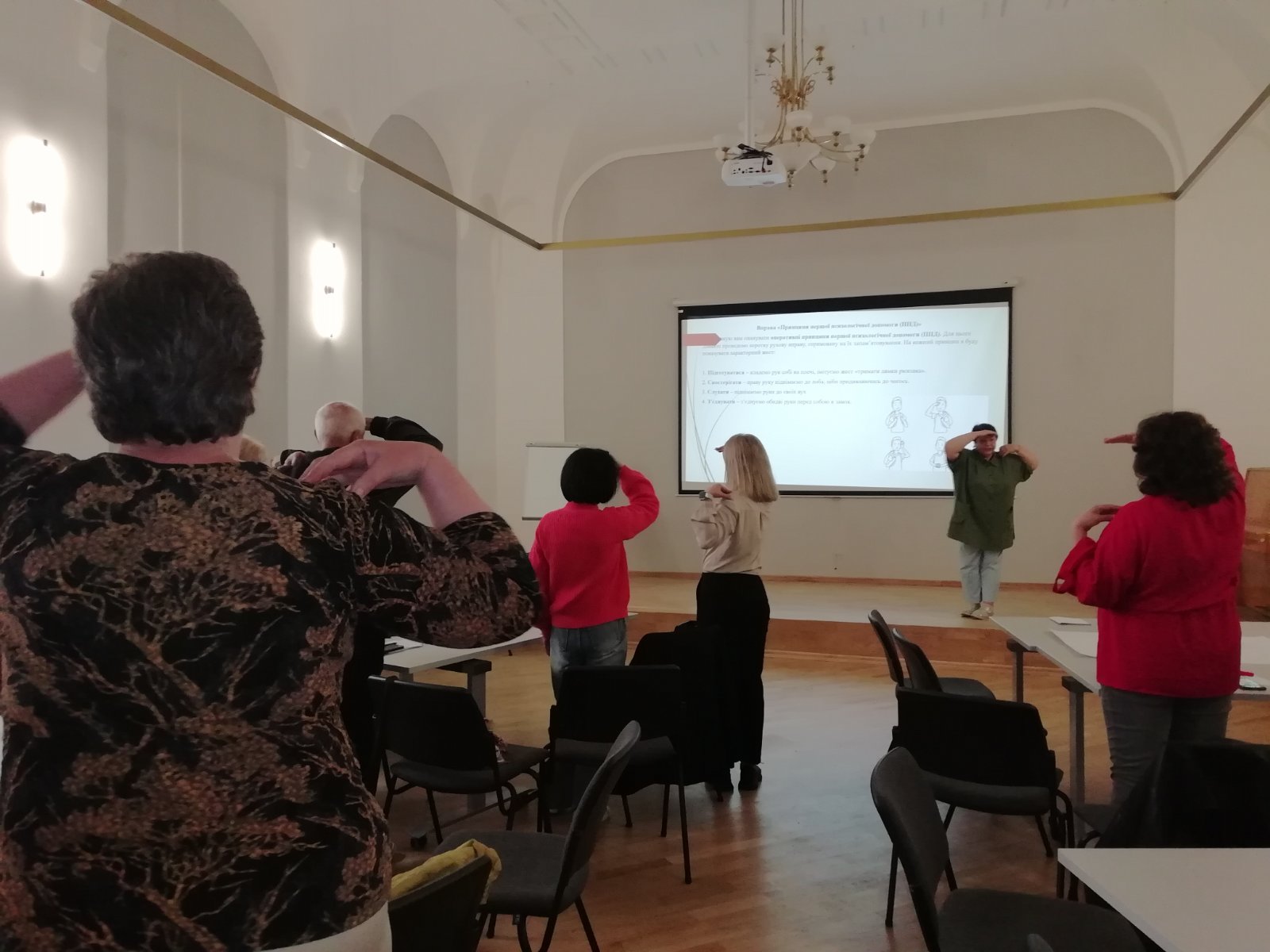 Не менш цікавою та корисною була діяльність із розпису одним розчерком без відриву олівця від паперу — цей прийом покращує розумову діяльність, розвиває креативність та допомагає розслабитися. У підсумку кожний учасник практикуму опанував алгоритми надання першої психологічної допомоги та правила використання «інформаційного бронежилета» — комплексу прийомів психологічного захисту в умовах гострого стресу.