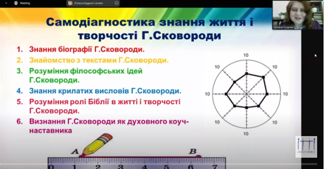 Учасники вебінару діагностували свої знання життя і творчості Г.Сковороди за допомогою коучингових технік «Шкалювання», «Колесо балансу»; замислювалися над сенсожиттєвими запитаннями, здійснюючи духовний самокоучинг; подорожували у печери свого серця, щоб знайти там нетлінні скарби мудрості і любові.