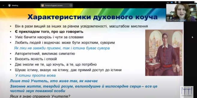 Мета вебінару – розкрити особливості духовного коучингу, обґрунтувати думку про коучинговий стиль мислення Г.Сковороди й актуальність його вчення про духовний розвиток людини в сучасну епоху.