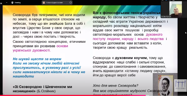 Своїми роздумами про актуальність мудрості Сковороди і його концепції щастя поділився гість вебінару Богдан Пиртик – керівник гуртка Дитячого центру туризму, спорту та екскурсій Львівської міської ради, дослідник священних писань.