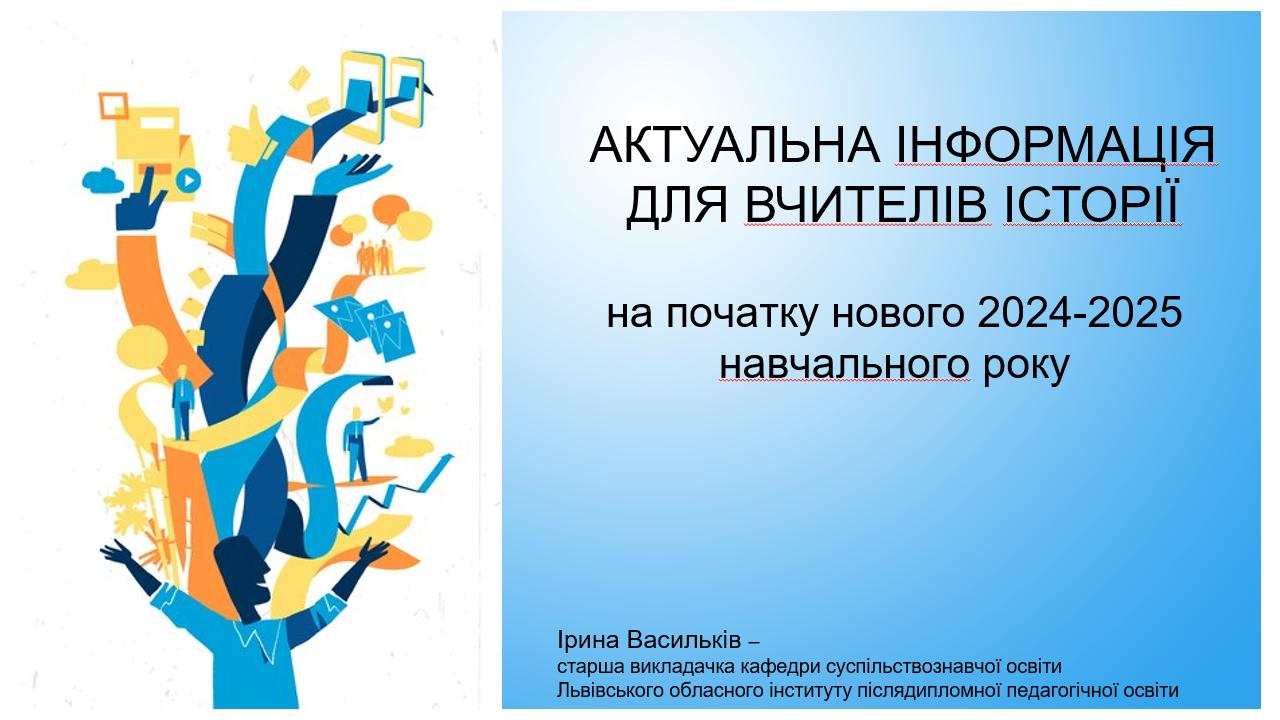22 серпня 2024 року відбувся вебінар для вчителів історії «Актуальна інформація для вчителів історії на початок нового 2024/25 навчального року», який проводила Ірина Васильків, старша викладачка кафедри суспільствознавчої освіти КЗ ЛОР «Львівський обласний інститут післядипломної педагогічної освіти».