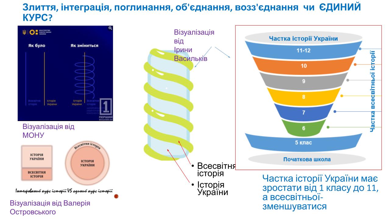 Серед іншого, Ірина Васильків запропонувала власну візуалізацію єдиного курсу історії та можливі варіанти укладання навчальних програм з урахуванням громадянознавчого компоненту.