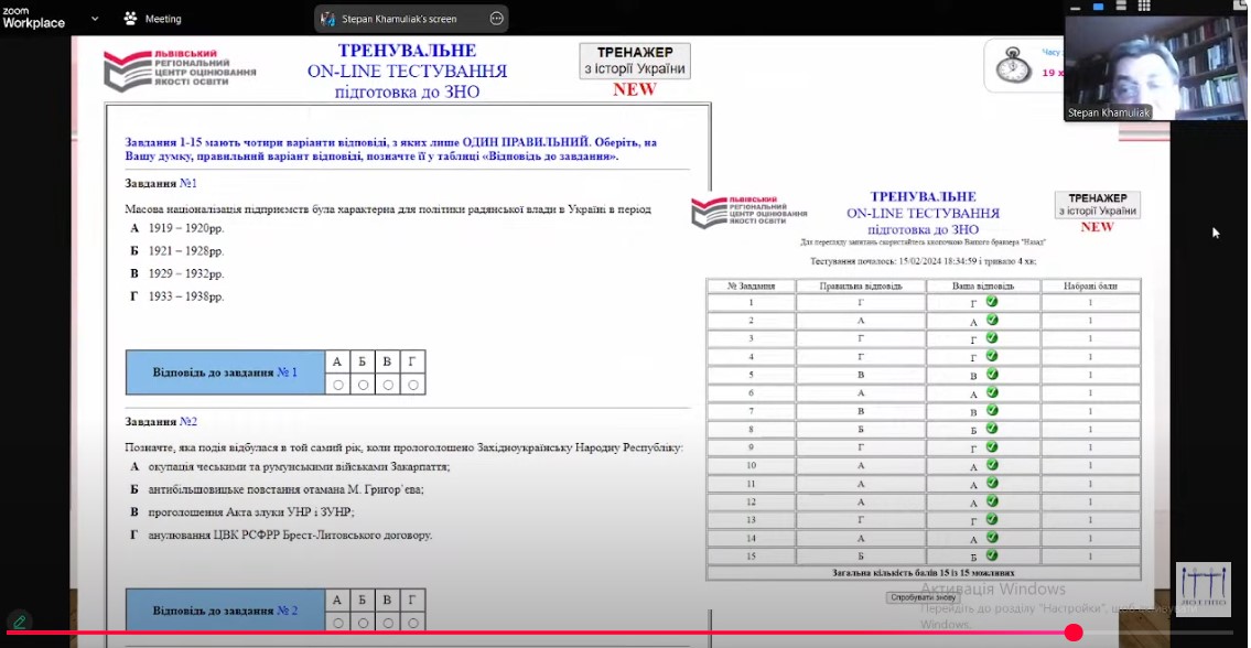Степан Хамуляк, начальник навчально-методичного відділу Львівського регіонального центру оцінювання якості освіти, викладач історії, проаналізував результати минулорічних тестувань, звернувши увагу на типові помилки, яких припускалися учасники, та успішні стратегії виконання завдань.