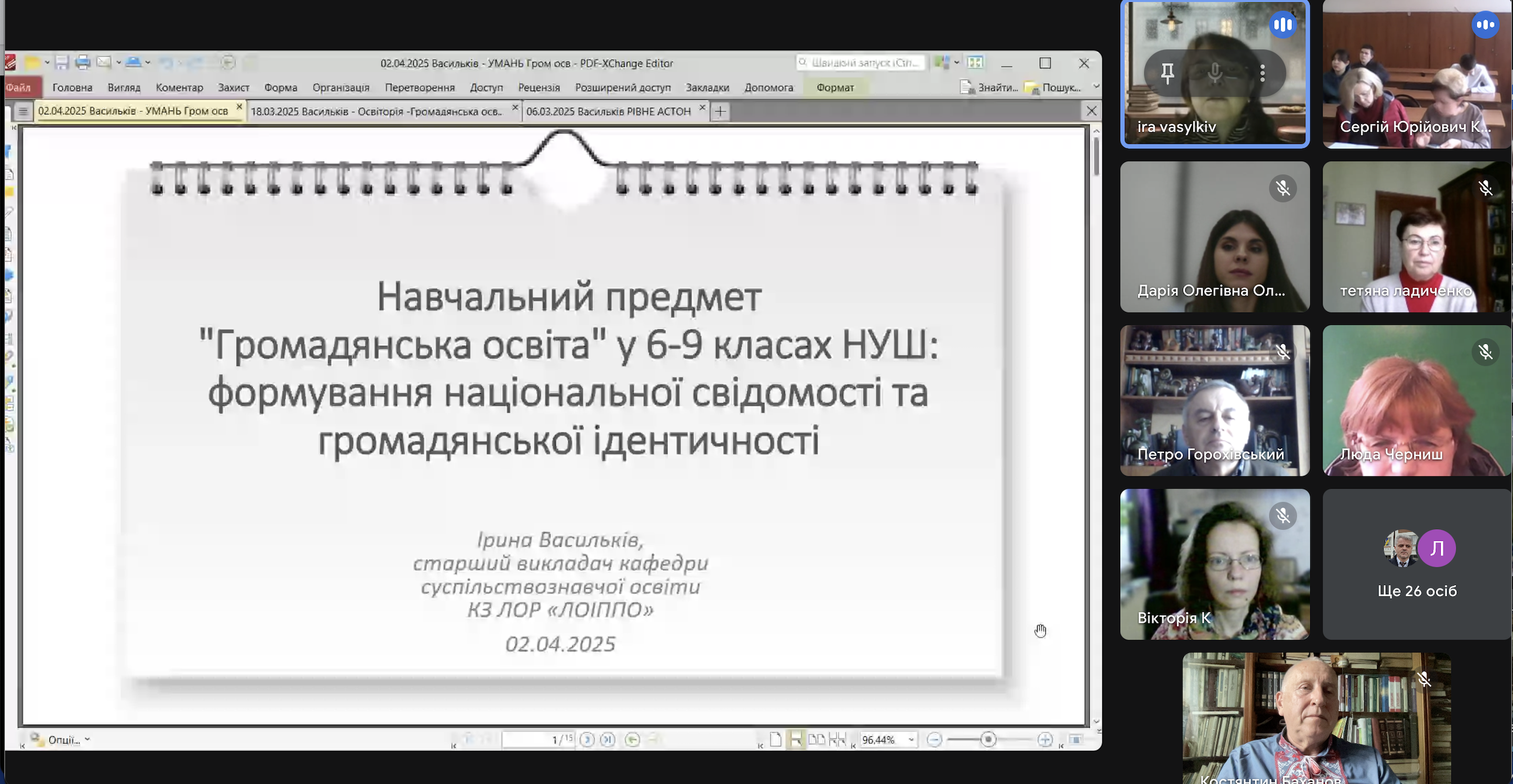 Ірина Васильків, старша викладачка кафедри суспільствознавчої освіти Львівського обласного інституту післядипломної педагогічної освіти, присвятила свій виступ проблемі «Навчальний предмет «Громадянська освіта» у 6-9 класах НУШ: формування національної свідомості та громадянської ідентичності».