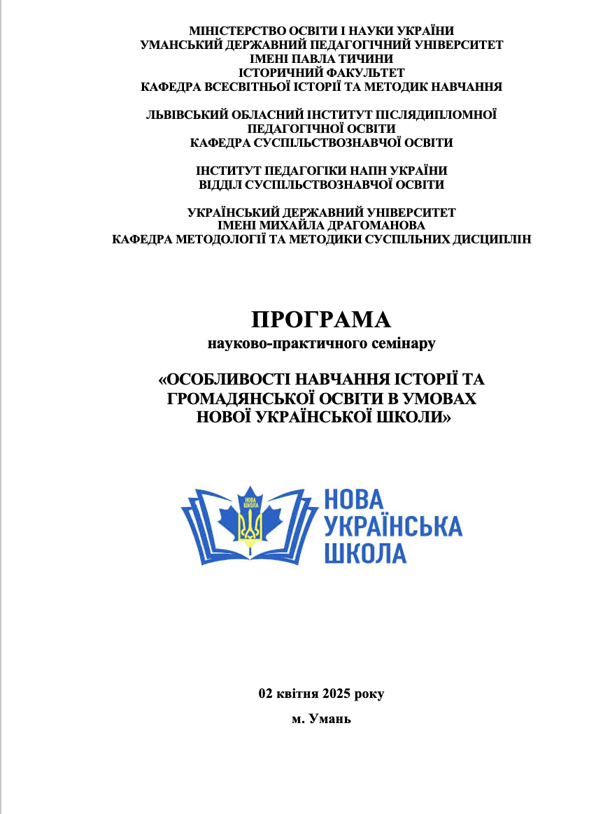 2 квітня 2025 року відбувся науково-практичний семінар «Особливості навчання історії та громадянської освіти в умовах Нової української школи», організований кафедрою всесвітньої історії та методик навчання історичного факультету Уманського державного педагогічного університету імені Павла Тичини, кафедрою суспільствознавчої освіти КЗ ЛОР «Львівський обласний інститут післядипломної педагогічної освіти», відділом суспільствознавчої освіти Інституту педагогіки НАПН України, кафедрою методології та методики суспільних дисциплін Українського державного університету імені Михайла Драгоманова. В його роботі взяли участь викладачі кафедри суспільствознавчої освіти.