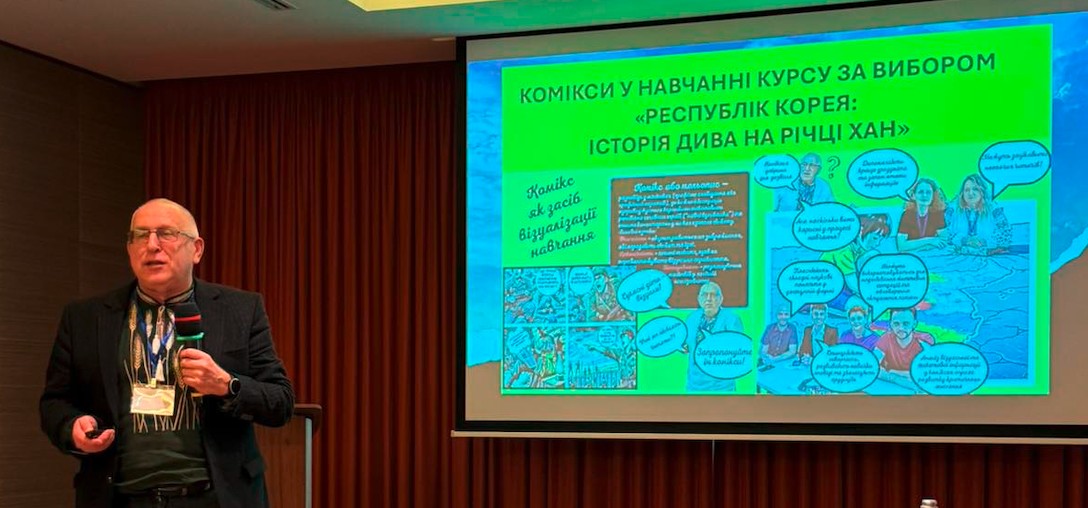 Професор Костянтин Баханов в своєму тематичному виступі «Знання про Республіку Корея в освітньому просторі України: останні здобутки» розповів про роботу творчої майстерні вчителів історії ЛОІППО «Розроблення і апробація навчально-методичного забезпечення курсу за вибором «Республіка Корея: історія дива на річці Хан» для учнів 10-11 класів» і виданий за результатами її роботи посібник «Комікси у навчанні курсу за вибором «Республіка Корея історія дива на річці Хан».