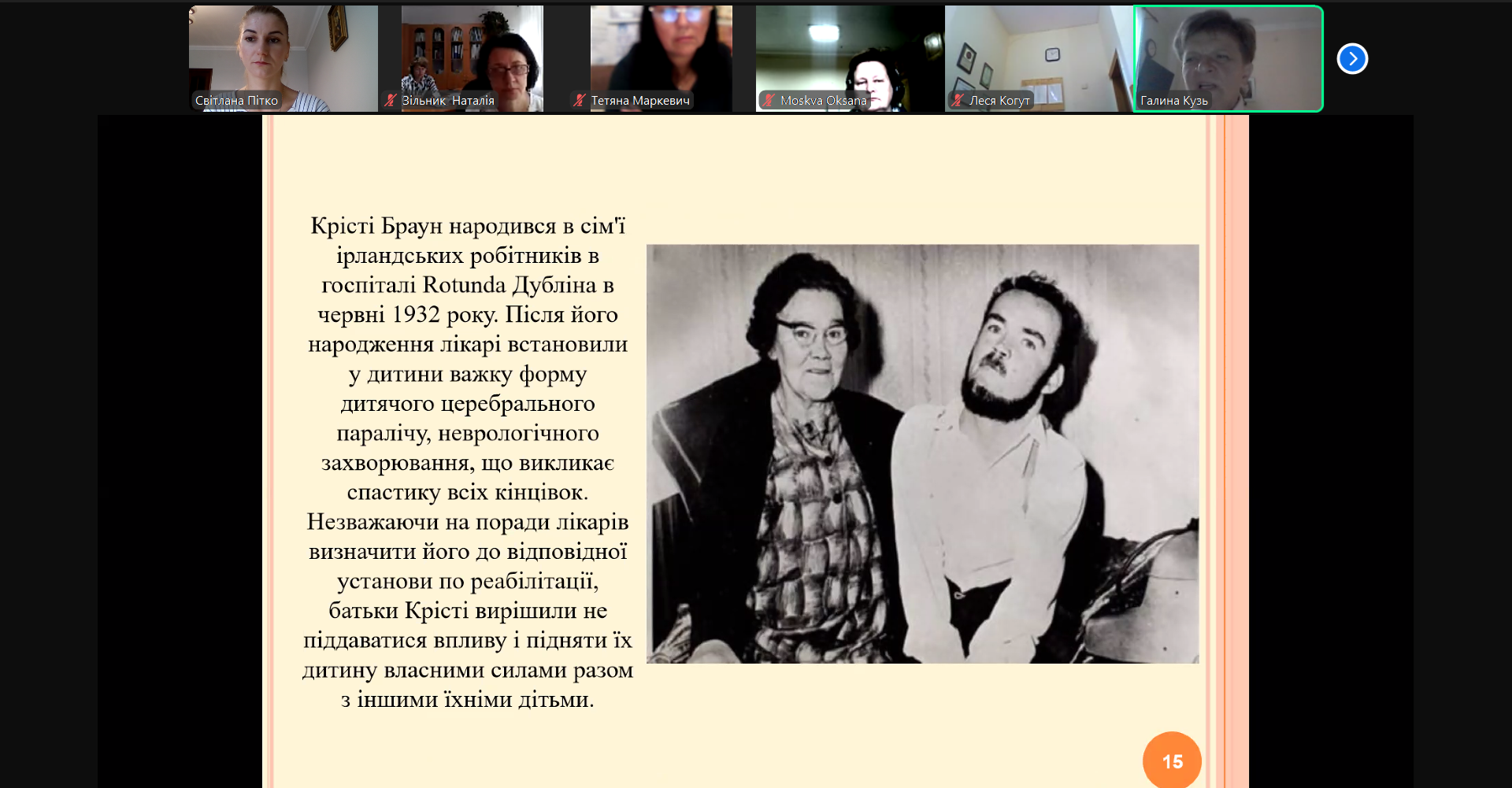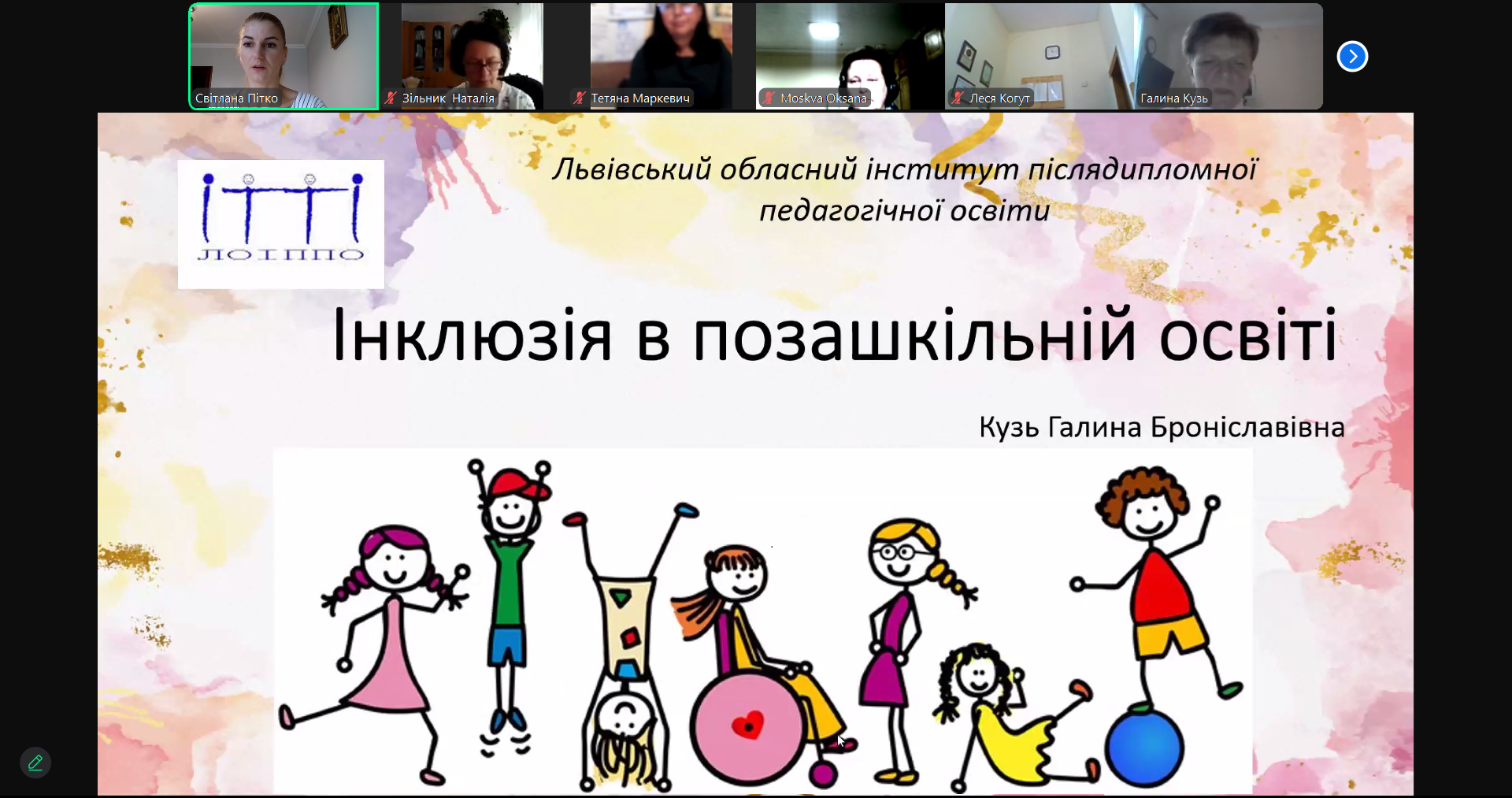 Галина Кузь, методистка кабінету «Центр підтримки інклюзивної освіти» КЗ ЛОР «Львівський обласний інститут післядипломної педагогічної освіти», розглянула актуальні питання впровадження принципів інклюзивного навчання в освітнє середовище, нормативно-правову базу, педагогічні та методичні аспекти роботи в інклюзивному освітньому середовищі, ознайомила з класифікацією категорій дітей з порушеннями в розвитку, охарактеризувала проблеми родинного виховання дітей з особливими освітніми потребами та надала рекомендації для роботи з батьками.