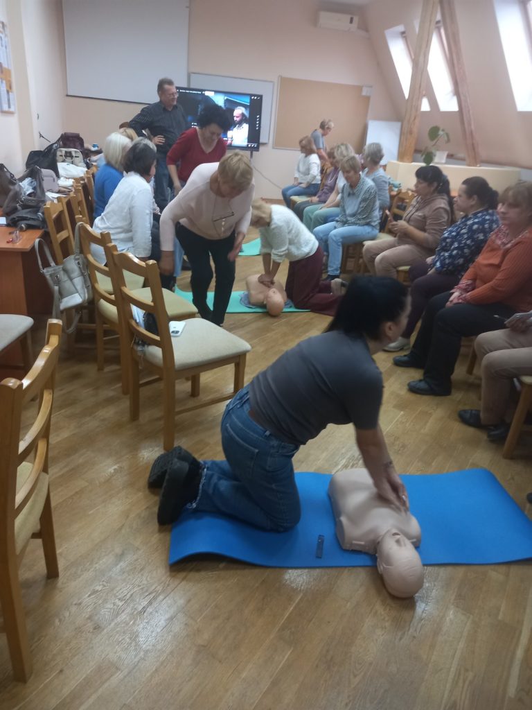 Після стислого теоретичного огляду педагоги перейшли до практики. У спеціально підготовленій залі відпрацьовували серцево-легеневу реанімацію, користування дефібрилятором, методи відновлення прохідності дихальних шляхів, алгоритми зупинки масивної кровотечі. Кожен міг спробувати власні сили, відчути реалістичність завдання й усвідомити, як важливо діяти швидко й без вагань.