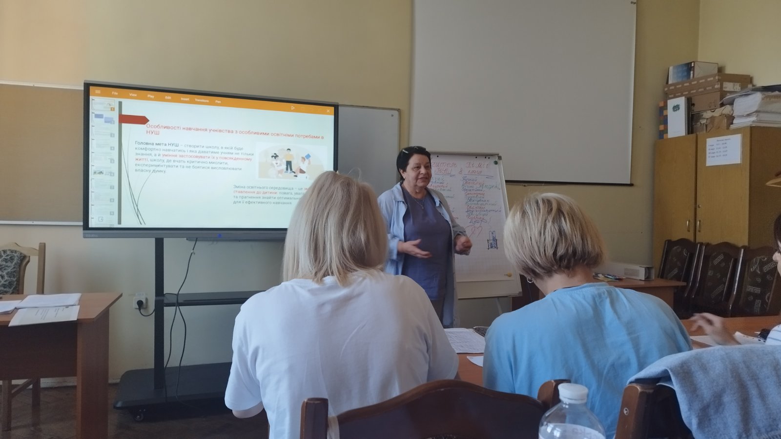 У межах заняття висвітлювалися питання організації освітнього процесу для учнів з особливими освітніми потребами в умовах НУШ, а також обговорювалися ознаки та методи подолання професійного вигорання педагогічних працівників. Завершальним етапом стало проведення рефлексії.