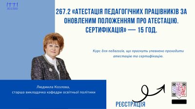 267.2 «Атестація педагогічних працівників за оновленим Положенням про атестацію. Сертифікація» — 15 год.
