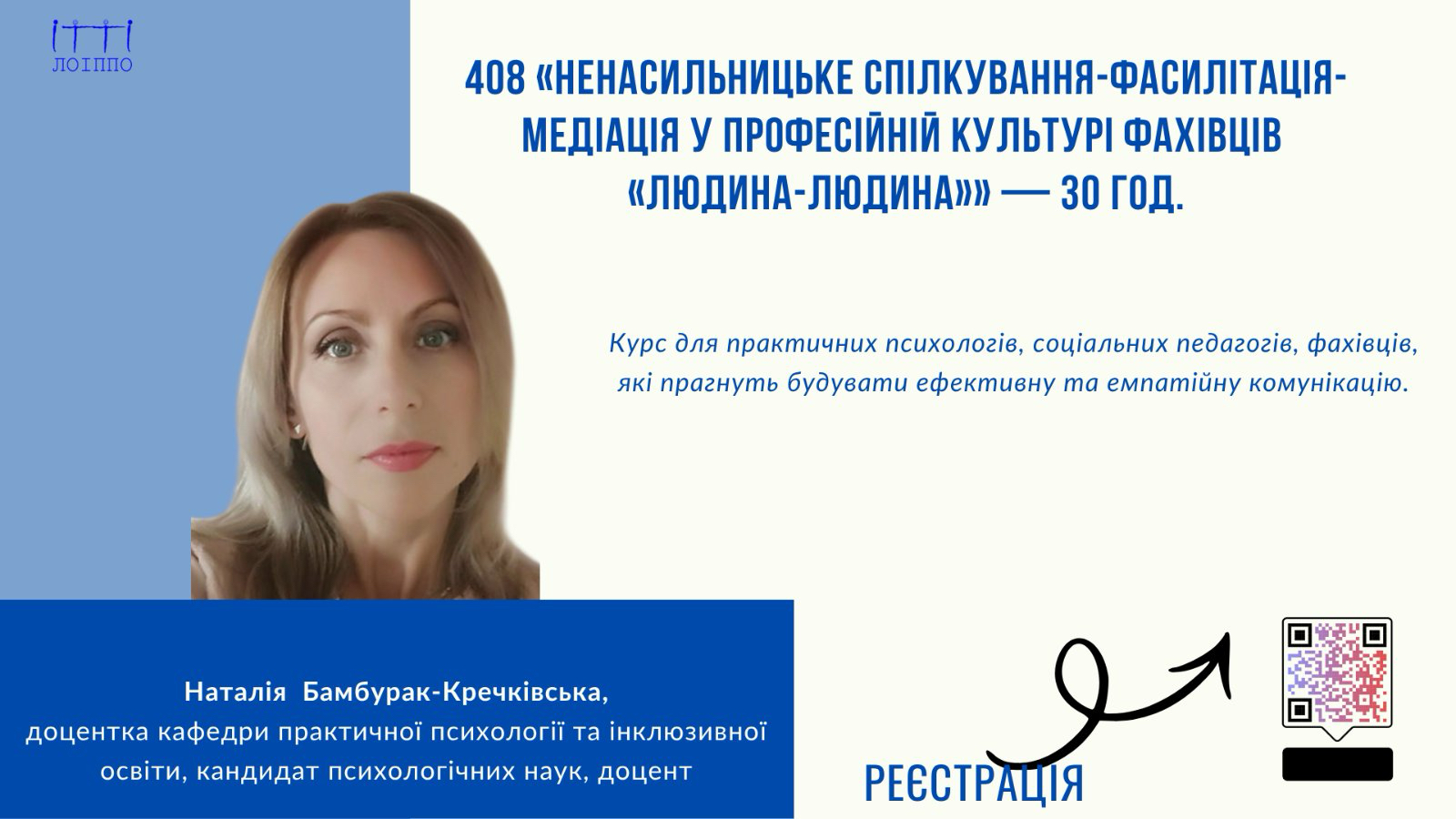 408 «Ненасильницьке спілкування-фасилітація-медіація у професійній культурі фахівців «людина-людина»» — 30 год.