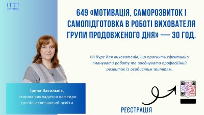 649 «Мотивація, саморозвиток і самопідготовка в роботі вихователя групи продовженого дня» — 30 год.