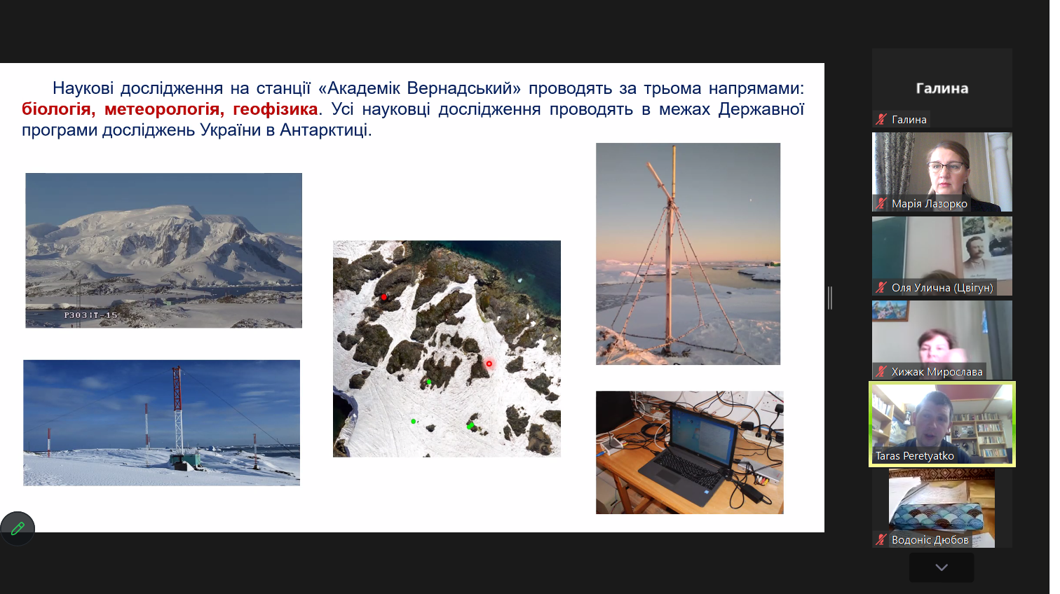 Організатор і модератор заходу – Марія Лазорко, старша викладачка кафедри природничо-математичної освіти КЗ ЛОР «Львівський обласний інститут післядипломної педагогічної освіти», яка привітала учасників заходу та ознайомила з планом зустрічі, під час якої обговорили роботу 28-ї Української антарктичної експедиції, мету і напрями досліджень, про життя і побут полярників в Антарктиці та зміни клімату.