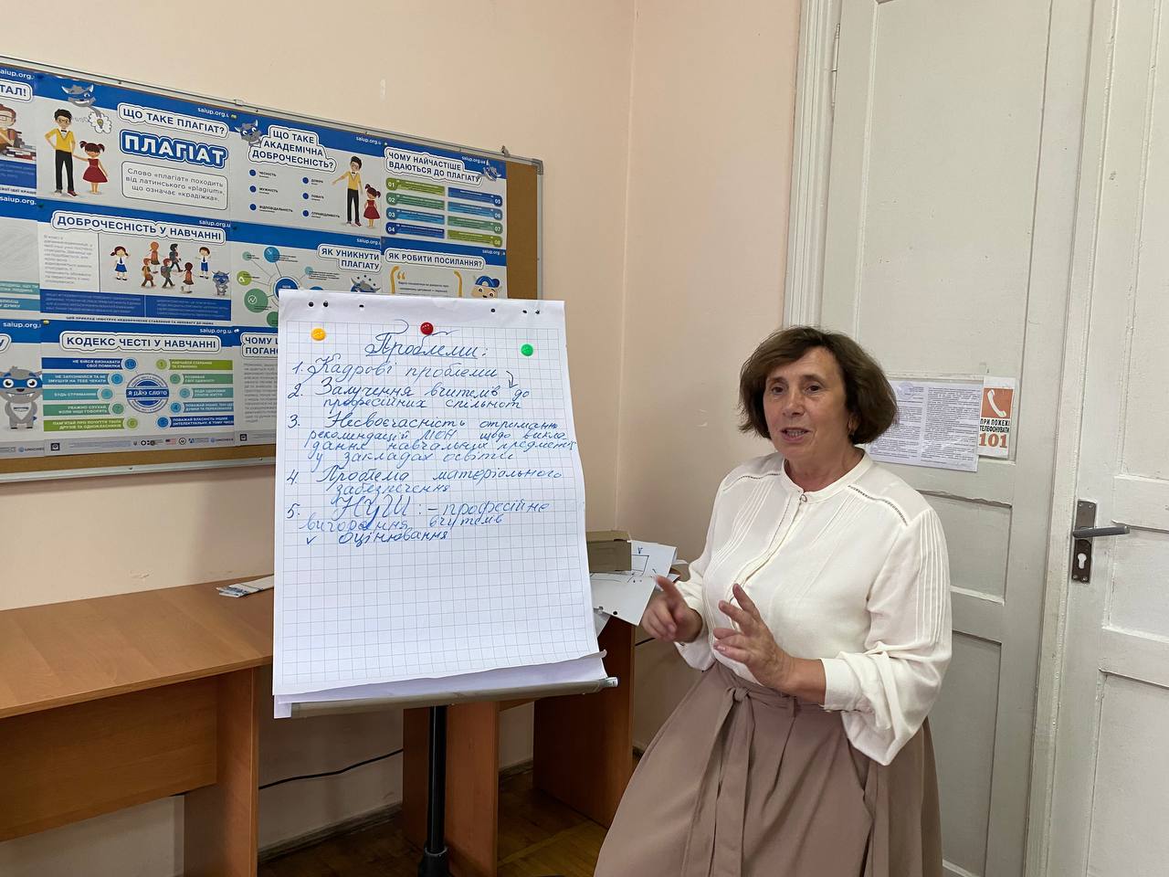 Далі учасники працювали в групах, обговорюючи актуальні виклики, з якими стикаються Центри у своїй щоденній діяльності. Цю частину зустрічі організувала Ірина Суховерська, завідувачка кабінету інформаційно-комунікаційної діяльності ЛОІППО. У фокусі уваги були питання ресурсного забезпечення, нормативно-правових аспектів, кадрового потенціалу центрів, організації роботи професійних спільнот та ефективної комунікації з педагогічними працівниками. Підсумки групової роботи презентували у формі виступів представників груп, що дозволило окреслити спільне бачення викликів та шляхів їх подолання.