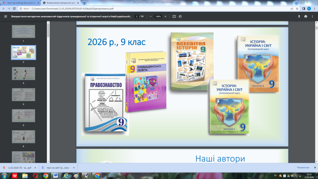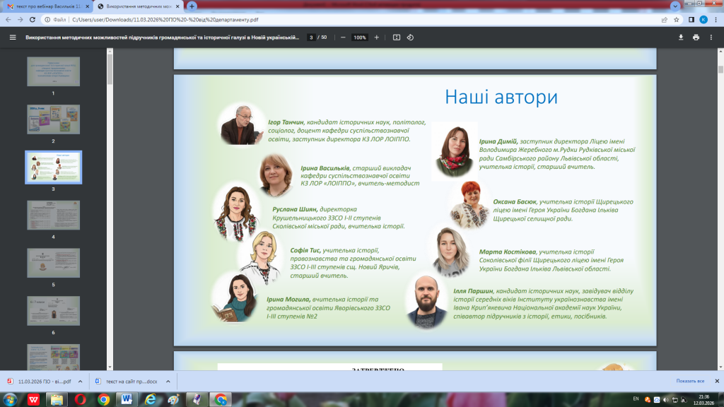 11 березня 2026 рокувідбувся вебінар, присвячений презентації підручників для 9 класу, створених фахівцями кафедри суспільствознавчої освіти Львівського обласного інституту післядипломної педагогічної освіти та вчителями-практиками Львівщини.