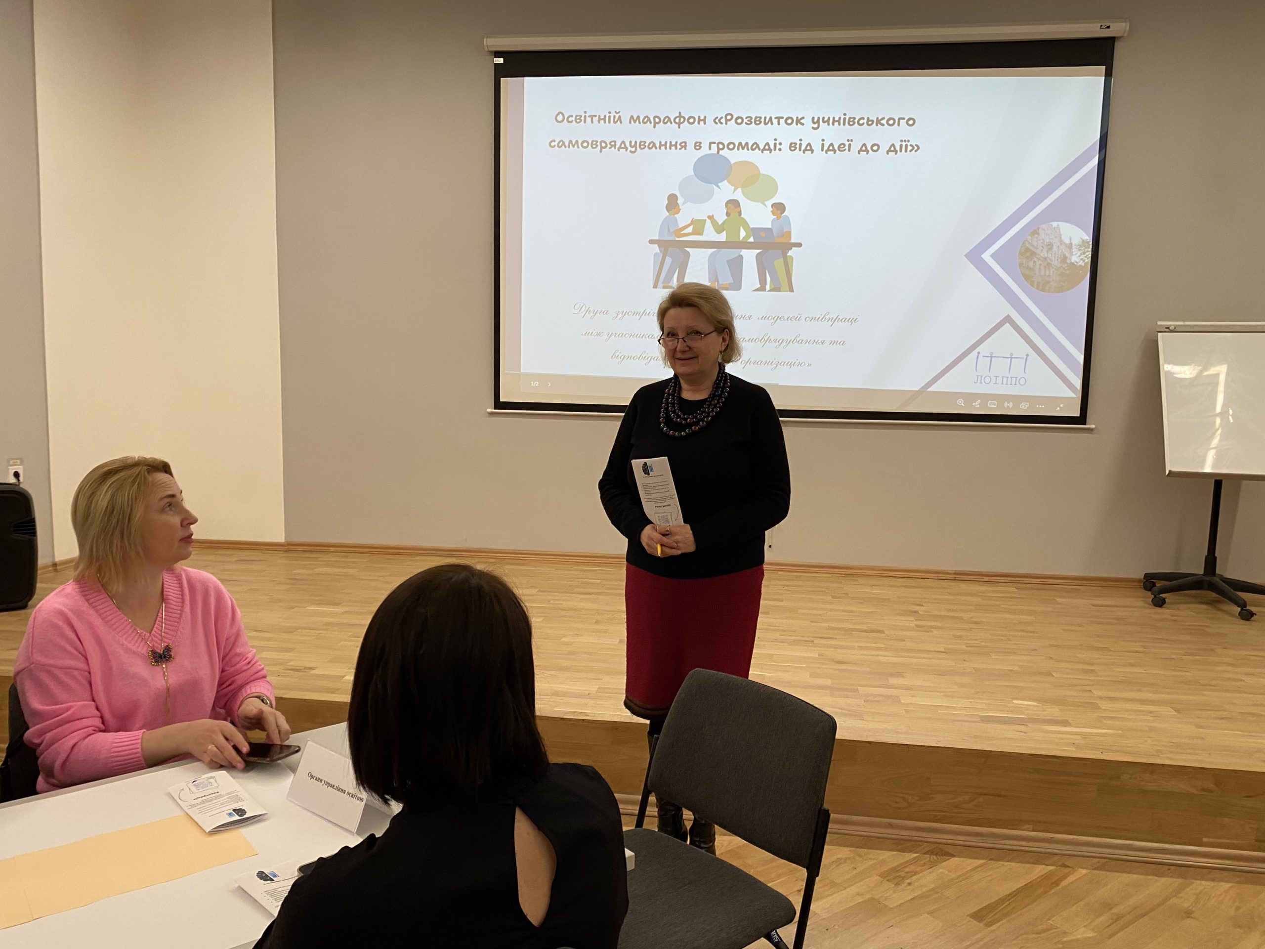Ірина Суховерська, голова консультативної ради з питань учнівського самоврядування при департаменті освіти і науки Львівської облдержадміністрації, завідувачка кабінету інформаційно-комунікаційної діяльності, старша викладачка кафедри суспільствознавчої освіти Львівського обласного інституту післядипломної педагогічної освіти, презентувала напрацьовані матеріали попередніх проєктів ЛОІППО та окреслила завдання марафону, ознайомила з планом роботи у 2025 році. Вона запропонувала проводити супервізії та консультації для відповідальних за учнівське самоврядування, на яких вони змогли б обговорити проблеми та виклики в організації учнівського самоврядування.