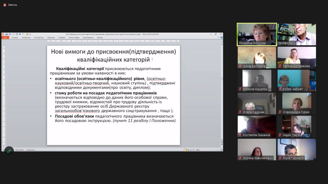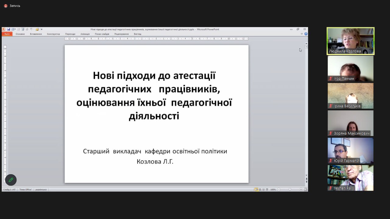 Вона ознайомила працівників з професійним стандартом педагогічних працівників та його практичним застосуванням. Людмила Козлова зазначила, що професійний стандарт має стати основою для розроблення і вдосконалення програм підготовки педагогів закладів вищої освіти, а суб’єкти підвищення кваліфікації,  в тому числі Львівський обласний інститут післядипломної педагогічної освіти, розробляють програми підвищення кваліфікації педагогічних працівників, використавши для їх складання професійні стандарти. Цей документ є основою для визначення критеріїв оцінювання вчителів під час атестації і сертифікації. Викладачка окреслила нові підходи до атестації педагогічних працівників та  оцінювання їхньої педагогічної діяльності, ознайомивши з новим Положенням про атестацію педагогічних працівників.