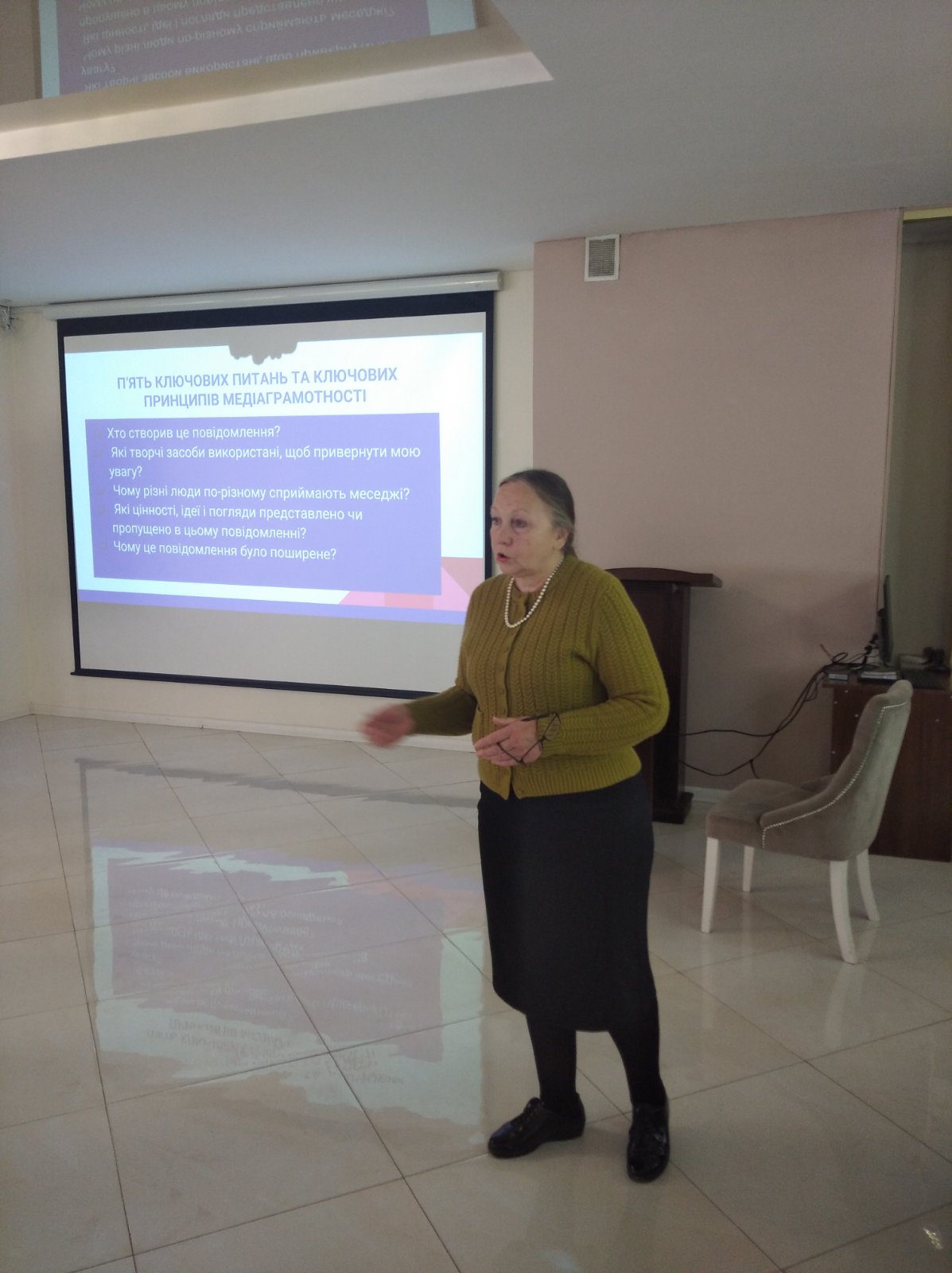 Наталія Пастушенко, заступниця директора з науково-педагогічної роботи ЛОІППО, кандидатка педагогічних наук, зосередила свою доповідь на розвитку медіаграмотності, наголосивши на необхідності навчати школярів орієнтуватися в інформаційному просторі, аналізувати джерела, розпізнавати фейки та маніпуляції, запропонувала практичні поради, як інтегрувати ці навички в уроки української мови та літератури.