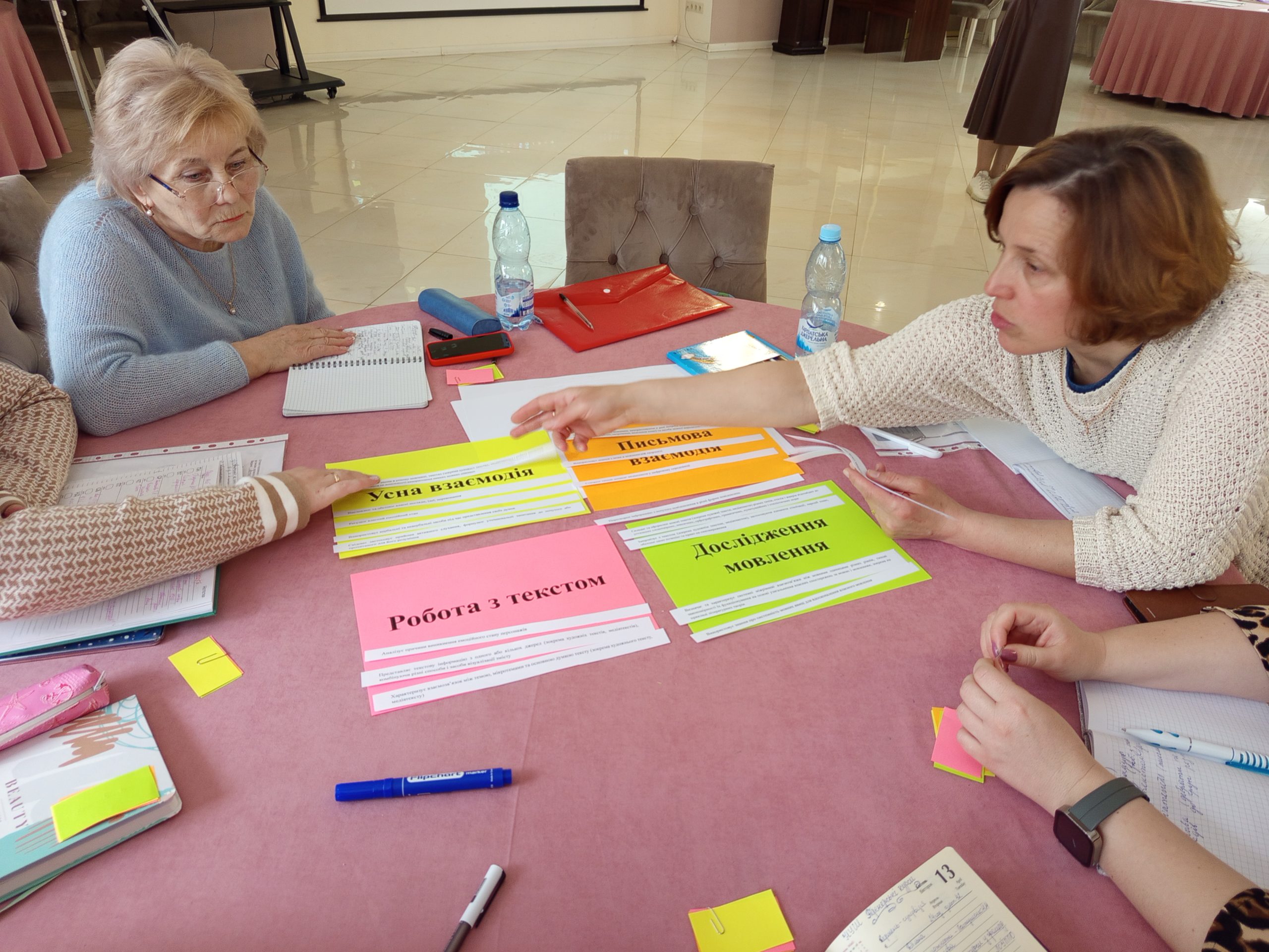 Оксана Дільна, доцентка кафедри гуманітарної освіти, кандидатка філологічних наук, ознайомила учасників із особливостями планування уроків у другому циклі базової середньої освіти відповідно до підходів НУШ. Найбільшу зацікавленість викликала представлена технологія зворотного дизайну, яка дає змогу планувати освітній процес, виходячи з очікуваних результатів навчання.