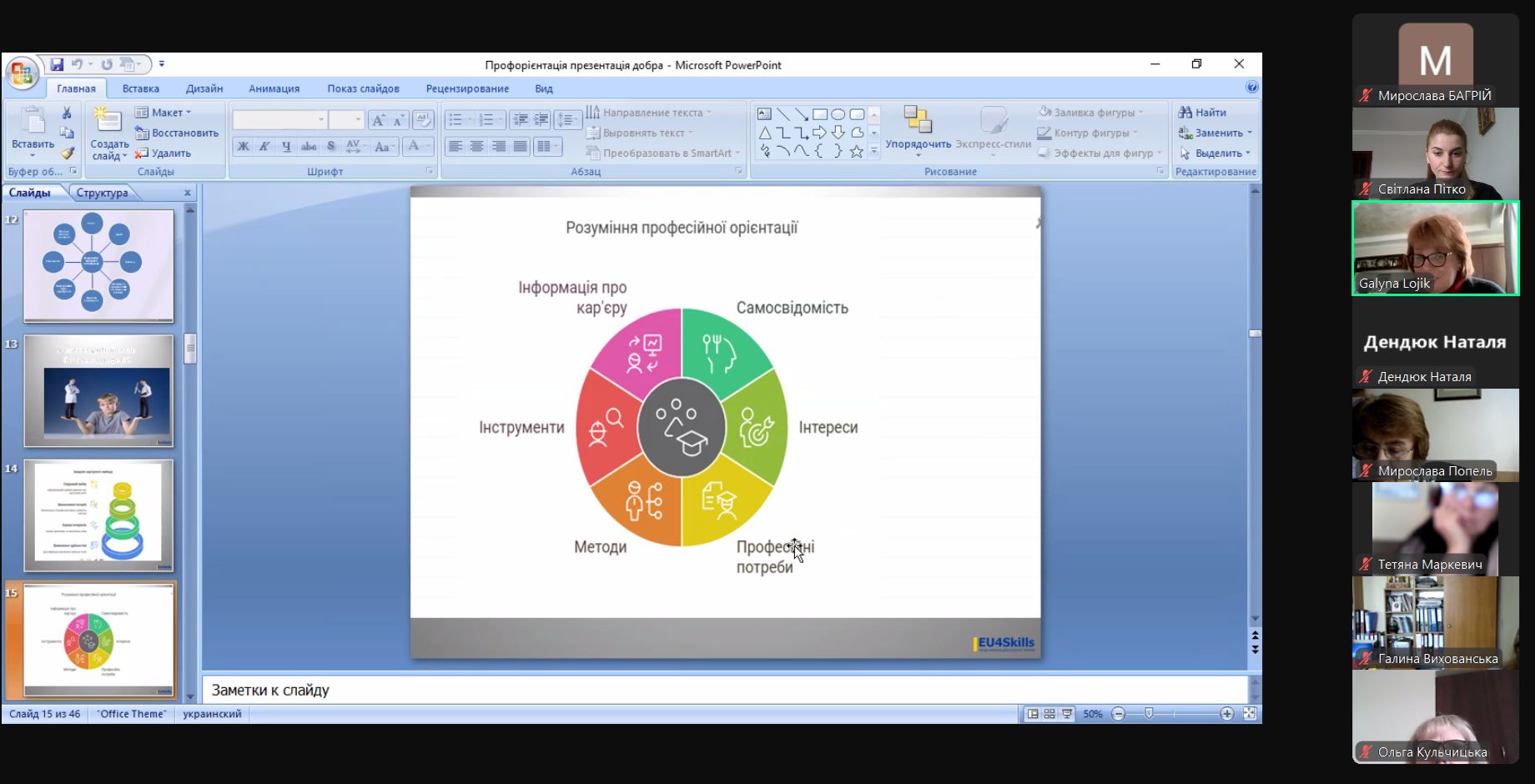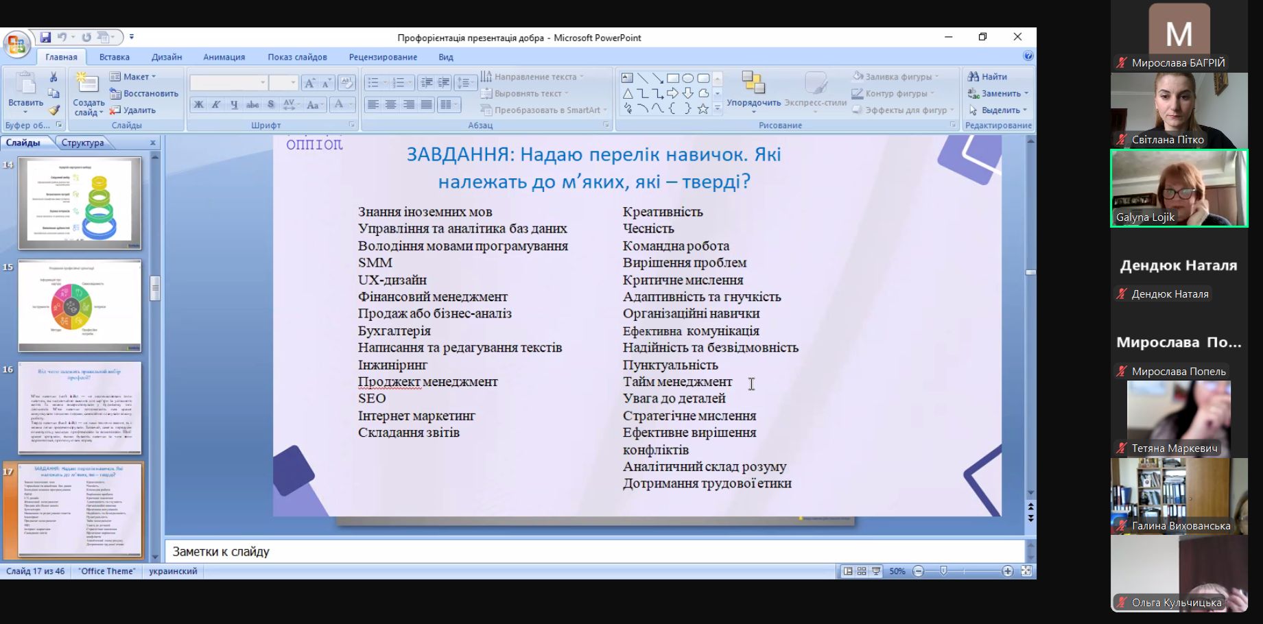 Галина Лоїк поділилася досвідом організації профорієнтаційної роботи в закладі освіти, ознайомила з новітніми методичними підходами та технологіями, розповіла про формування системного та наскрізного підходу до планування та реалізації профорієнтаційної роботи з метою найповнішого розкриття індивідуального потенціалу здобувачів освіти.