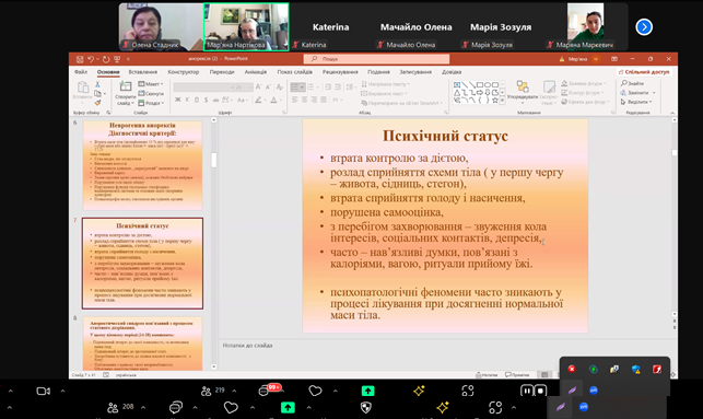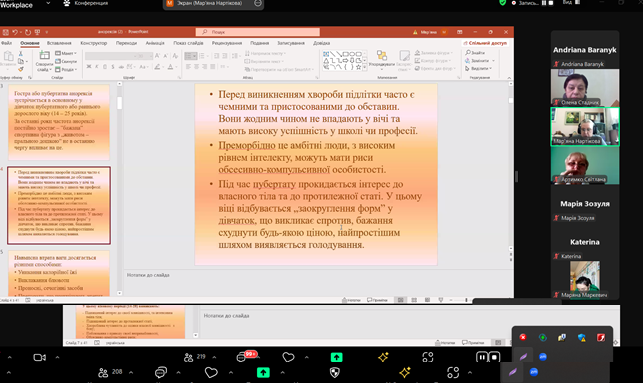 Спікерка заходу – Мар’яна Нартікова, дитячий психіатр, психотерапевт, розповіла про анорексичний синдром, пов’язаний з періодом статевого дозрівання, діагностичні критерії неврогенної анорексії та булімії, особливості поведінки підлітків: підвищений інтерес до протилежної статі, хвороблива чутливість до оцінки власного тіла з боку оточуючих, обсесивно-компульсивні риси, протестна поведінка, перфекціонізм, відмова від їжі, інфантилізм. Вона зазначила, що формування ознак розладів харчової поведінки займає тривалий час. Спочатку вони старанно ховаються від оточуючих, але потім стають явними. Розлади харчової поведінки – це хвороба і необхідно доносити до підлітків інформацію, яка стосується їхнього здоров’я та добробуту. Пояснення і донесення до учасників освітнього процесу необхідної інформації про психічне здоров’я, психологічні проблеми та їх наслідки для особистості – першочергове завдання фахівців психологічної служби.