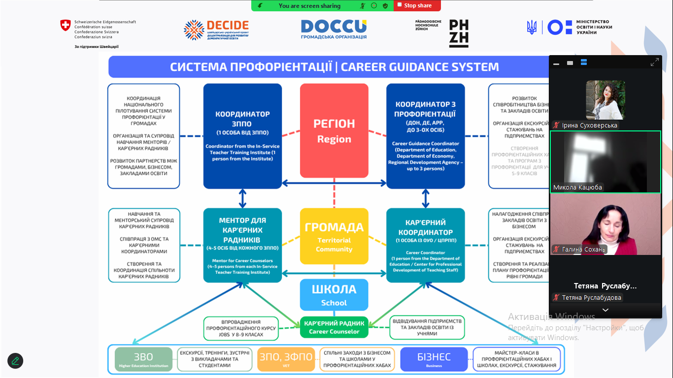 У Львівському обласному інституті післядипломної педагогічної освіти відбулася робоча нарада, присвячена обговоренню та координації дій у межах впровадження Системи профорієнтації у територіальних громадах. Захід організовано в рамках швейцарсько-українського проєкту DECIDE – «Децентралізація для розвитку демократичної освіти», що реалізується ГО DOCCU та PHZH International Projects in Education за підтримки Embassy of Switzerland in Ukraine / Посольства Швейцарії в Україні.