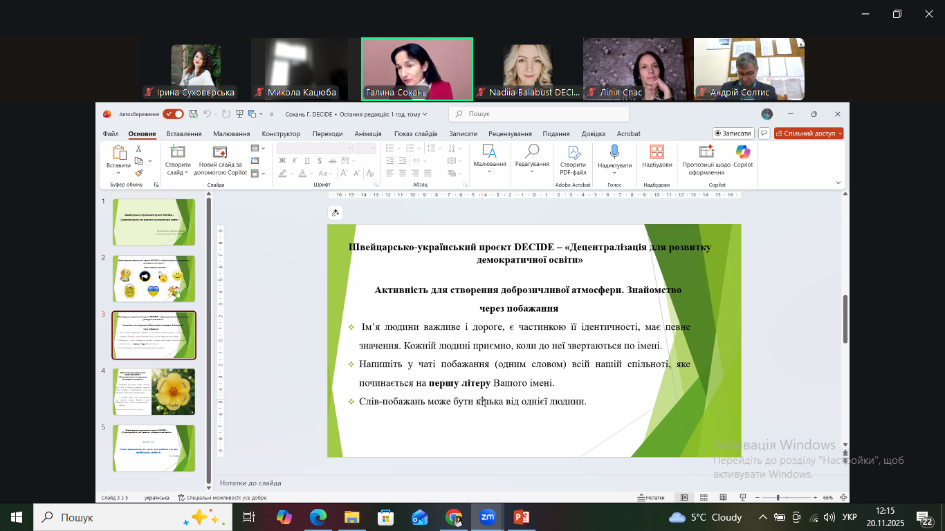 Під час зустрічі Галина Сохань, завідувачка кафедри суспільствознавчої освіти Львівського обласного інституту післядипломної педагогічної діяльності, кандидатка філологічних наук, менторка проєкту, провела низку активностей, спрямованих на формування доброзичливого робочого середовища, визначення правил спільної діяльності та ефективної комунікації між учасниками освітнього процесу.