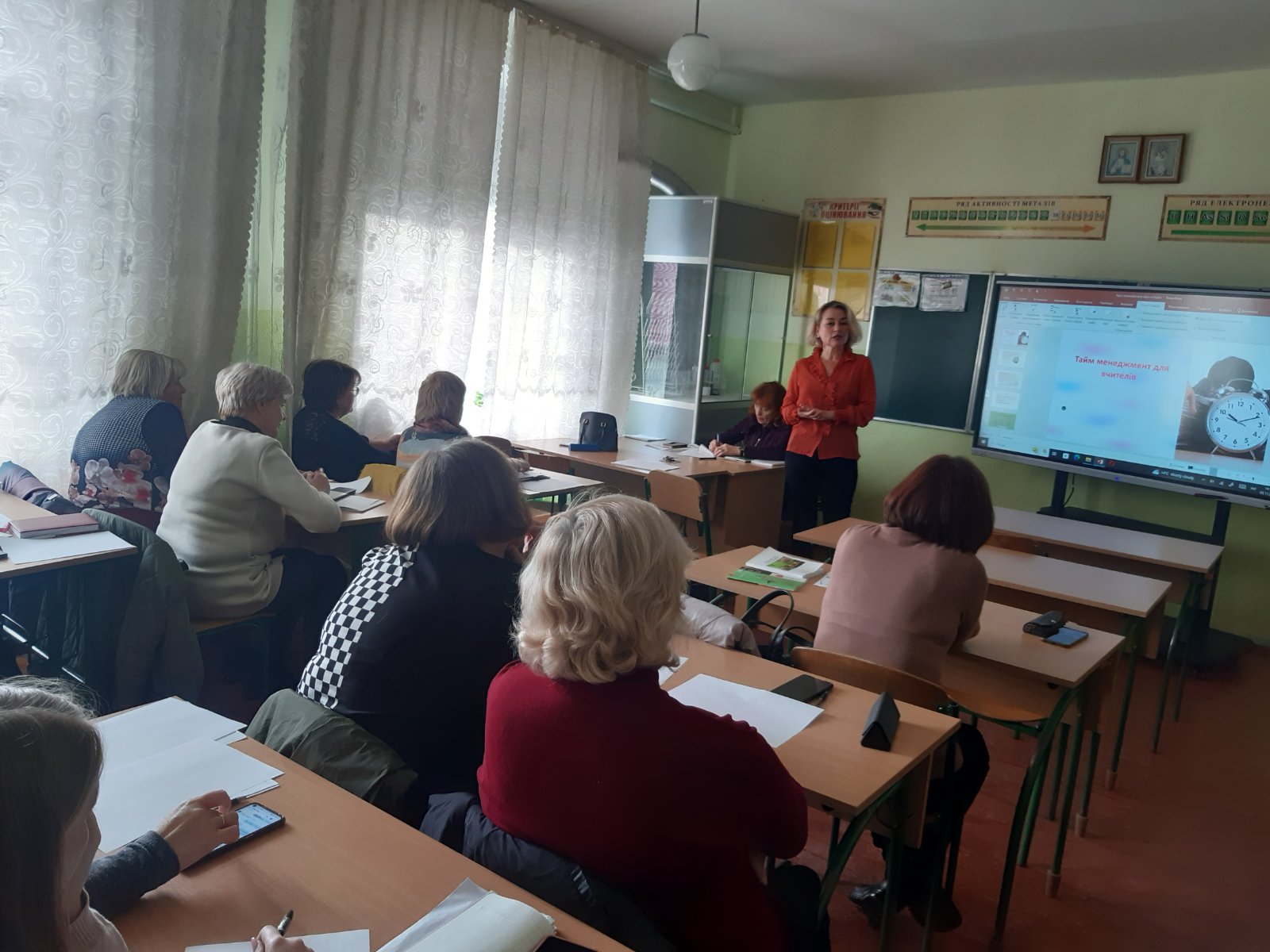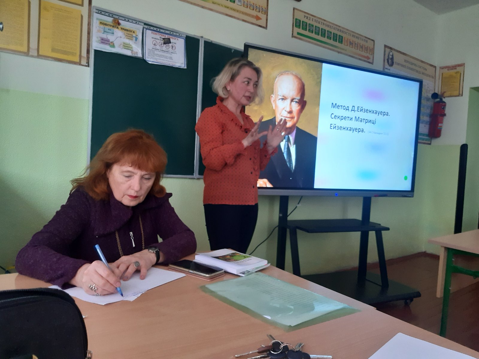 Педагогів семінару зацікавила інформація про методи тайм-менеджменту, зокрема матриця Ейзенхауера. Дана методика дозволяєзарезервувати час для виконання ключових завдань у разі необхідності коригування або перевірки, диференціювати поточні і майбутні завдання за пріоритетом, а справи з найменшим пріоритетом виключити з кола справ. На практичному занятті учителі виконали вправи: «Поглиначі» і «пастки» часу», «Мій капітал часу». Проведення тесту для визначення ефективності використання робочого часу «Куди йде час» уможливлює приймання рішення про пріоритети в тайм-менеджменті.