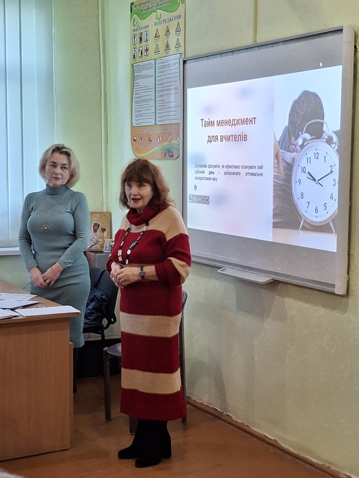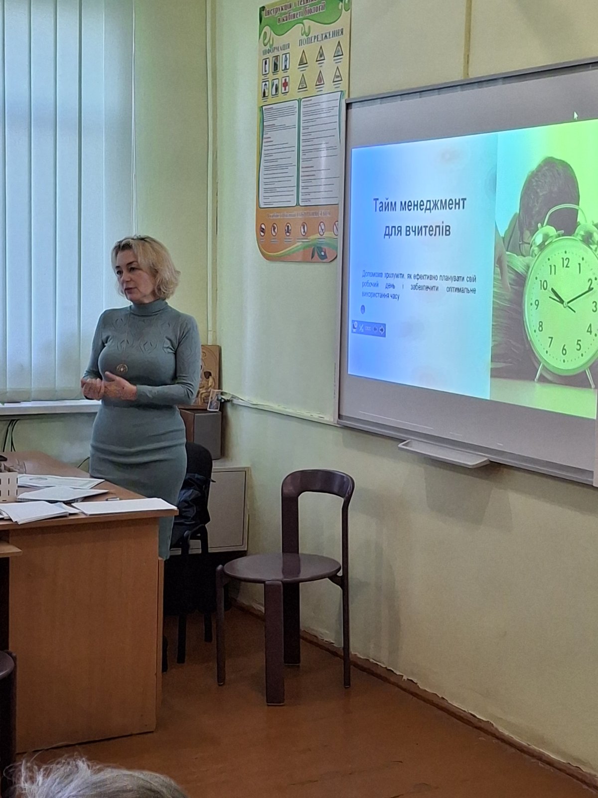 Значний інтерес учасників викликала тема тайм-менеджменту вчителя, яку розкрила Олена Цогла, старша викладачка кафедри природничо-математичної освіти, кандидатка економічних наук. Серед найбільших втрат часу було названо: нескінченні звіти «для галочки», хаотичні чати й повідомлення 24/7, ідеалізацію кожного матеріалу, роботу без пріоритетів та страх делегувати або спростити процеси.