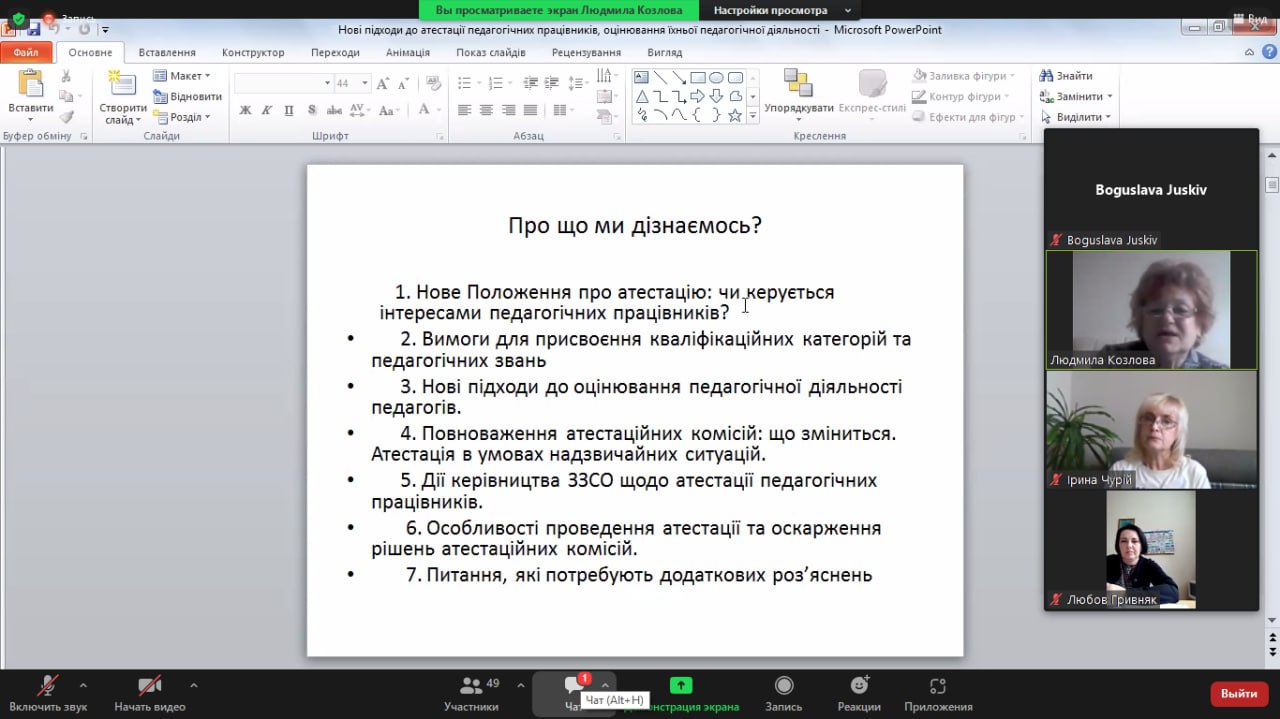 У семінарі-практикумі взяли участь 62 керівники закладів позашкільної освіти Львівської області. Людмила Козлова, старша викладачка кафедри освітньої політики КЗ ЛОР ЛОІППО, окреслила новації у сфері атестації педагогічних працівників та оцінювання їхньої діяльності. Значну увагу доповідачка приділила застосуванню сучасних підходів у практичній діяльності атестаційних комісій закладів позашкільної освіти. Упродовж розгляду зазначеної теми надано вичерпні відповіді на поставлені учасниками запитання. Також під час семінару відбулося активне обговорення актуальних питань оцінювання професійної діяльності педагогічних працівників та обмін думками щодо їхнього вирішення.