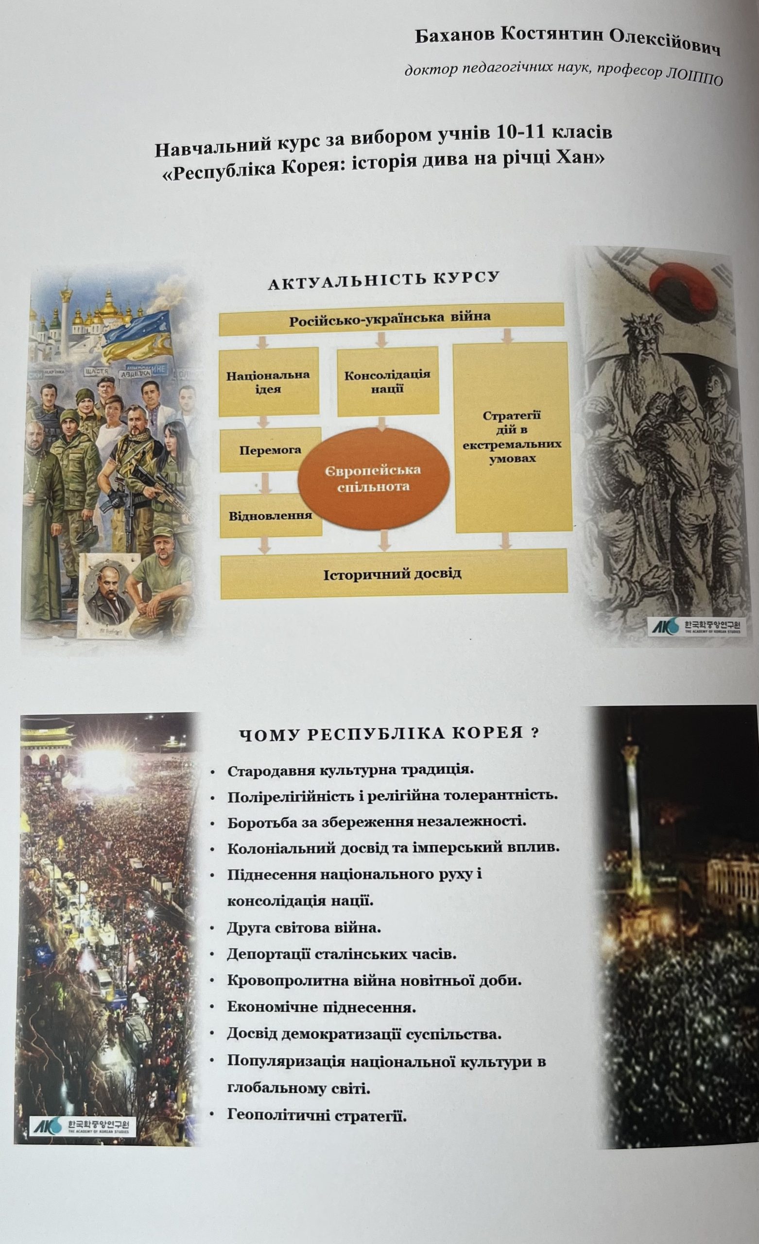 Одним з ключових інформаційних, наукових і дидактичних моментів круглого столу стала презентація програми навчального курсу за вибором учнів 10–11-го класів «Республіка Корея: історія дива на річці Хан». Керівник авторського колективу – доктор педагогічних наук, професор кафедри суспільствознавчої освіти КЗ ЛОР «Львівський обласний інститут післядипломної педагогічної освіти» Костянтин Баханов.