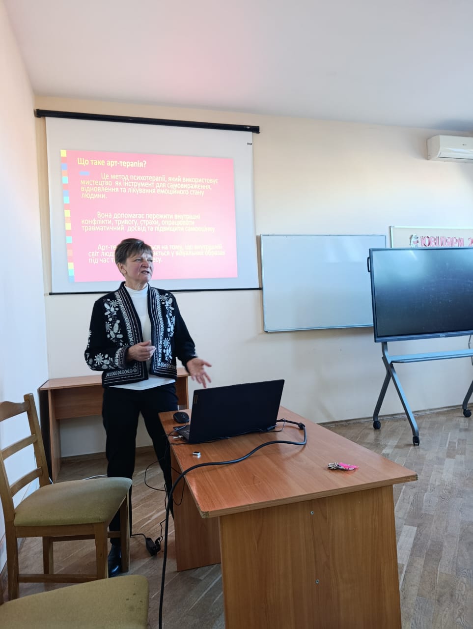 Під час теоретичної частини учасники отримали огляд основних напрямів арттерапії, які активно застосовуються в інклюзивному освітньому просторі. Галина Кузь представила сучасні підходи, методики й особливості використання різних видів мистецтва у роботі з дітьми з особливими освітніми потребами.