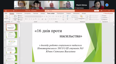 Про заходи, реалізовані в межах кампанії у своєму закладі, розповіла Світлана Юзюк, соціальний педагог Новояворівського ЗЗСО І–ІІІ ступенів № 3. Зокрема, йшлося про проведення класних годин, лекцій і бесід щодо різних видів насильства, оновлення інформаційних стендів з контактами гарячих ліній та алгоритмами дій у кризових ситуаціях. Педагогиня також презентувала карткову гру «Коло безпеки», яка в доступному ігровому форматі знайомить учнів із темами виявлення насильства та шляхами захисту.