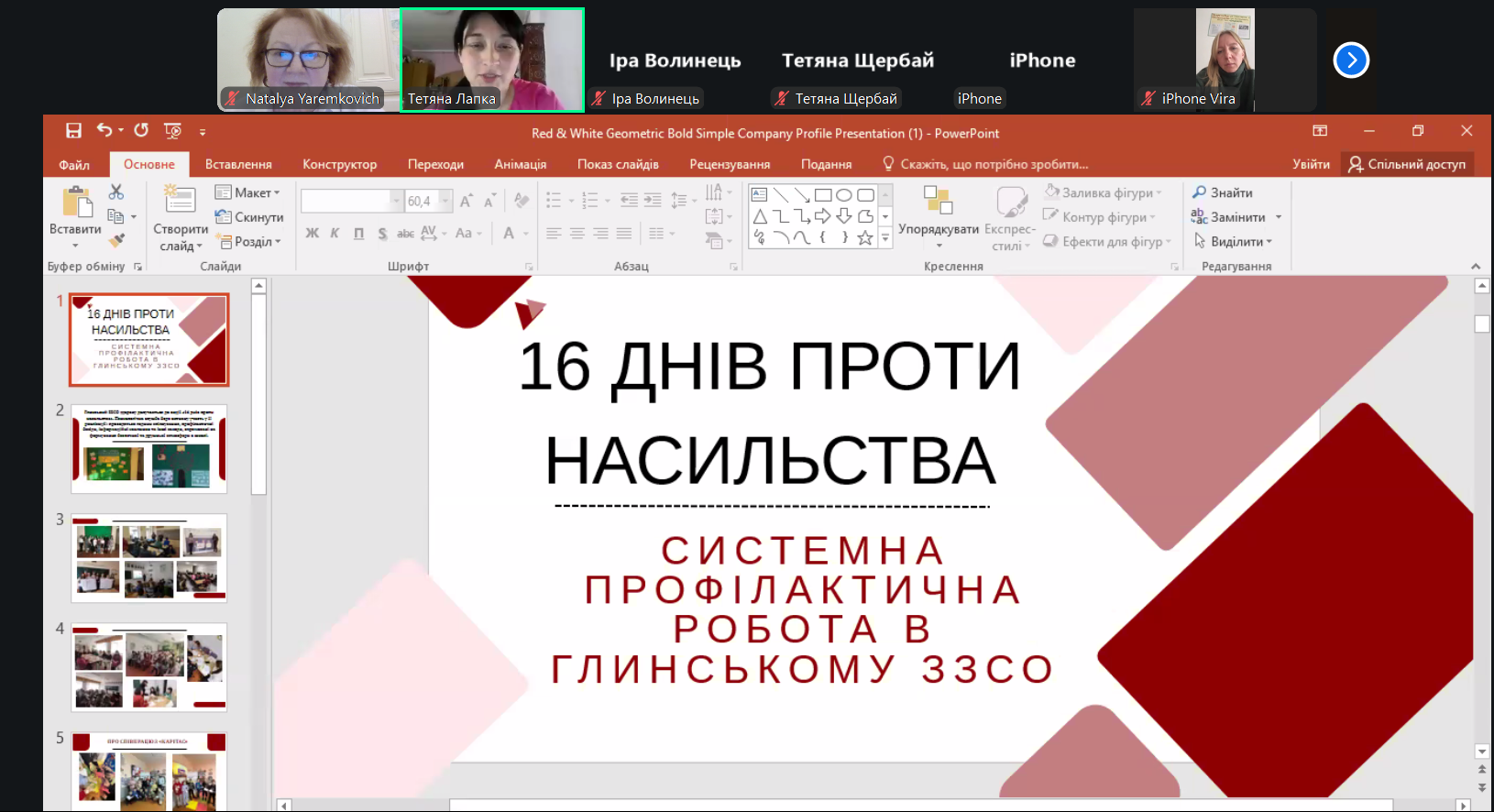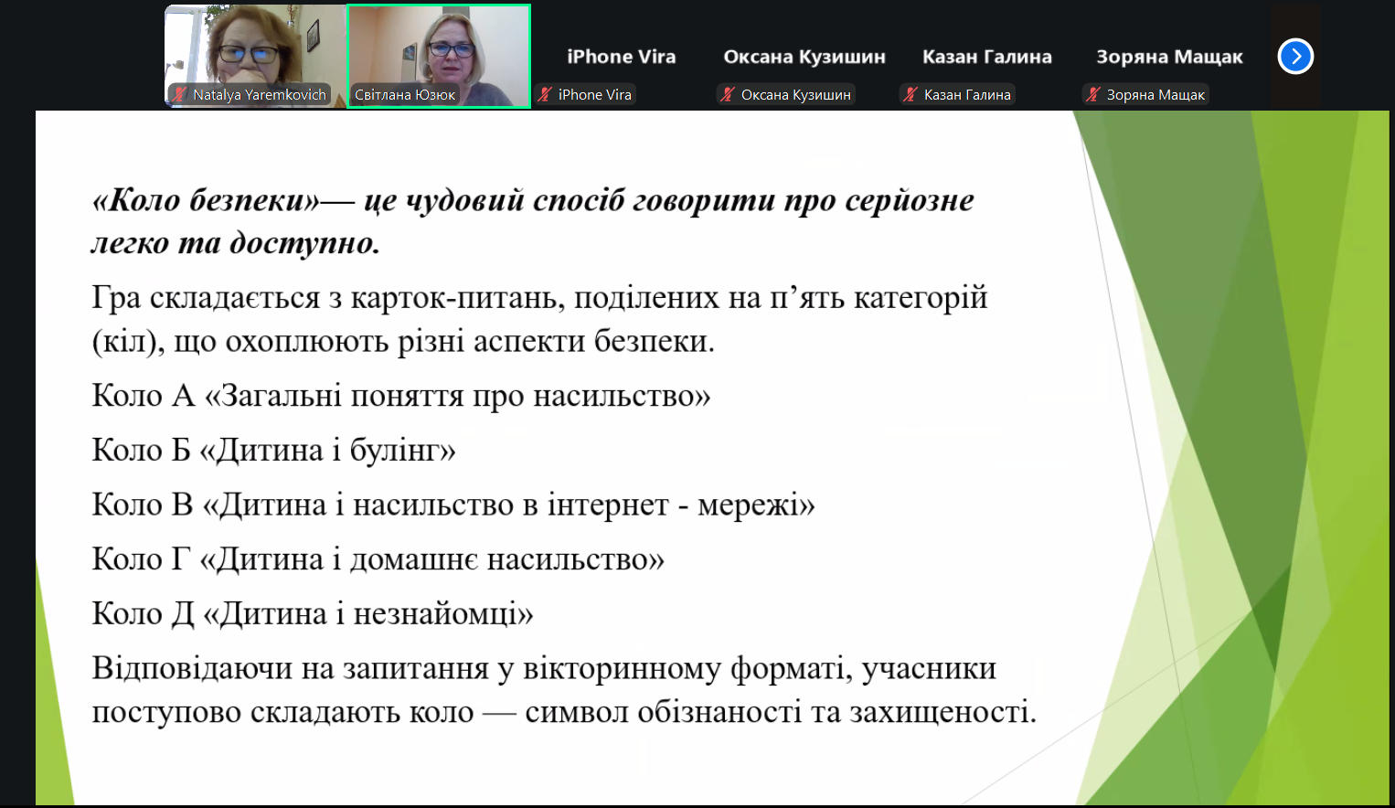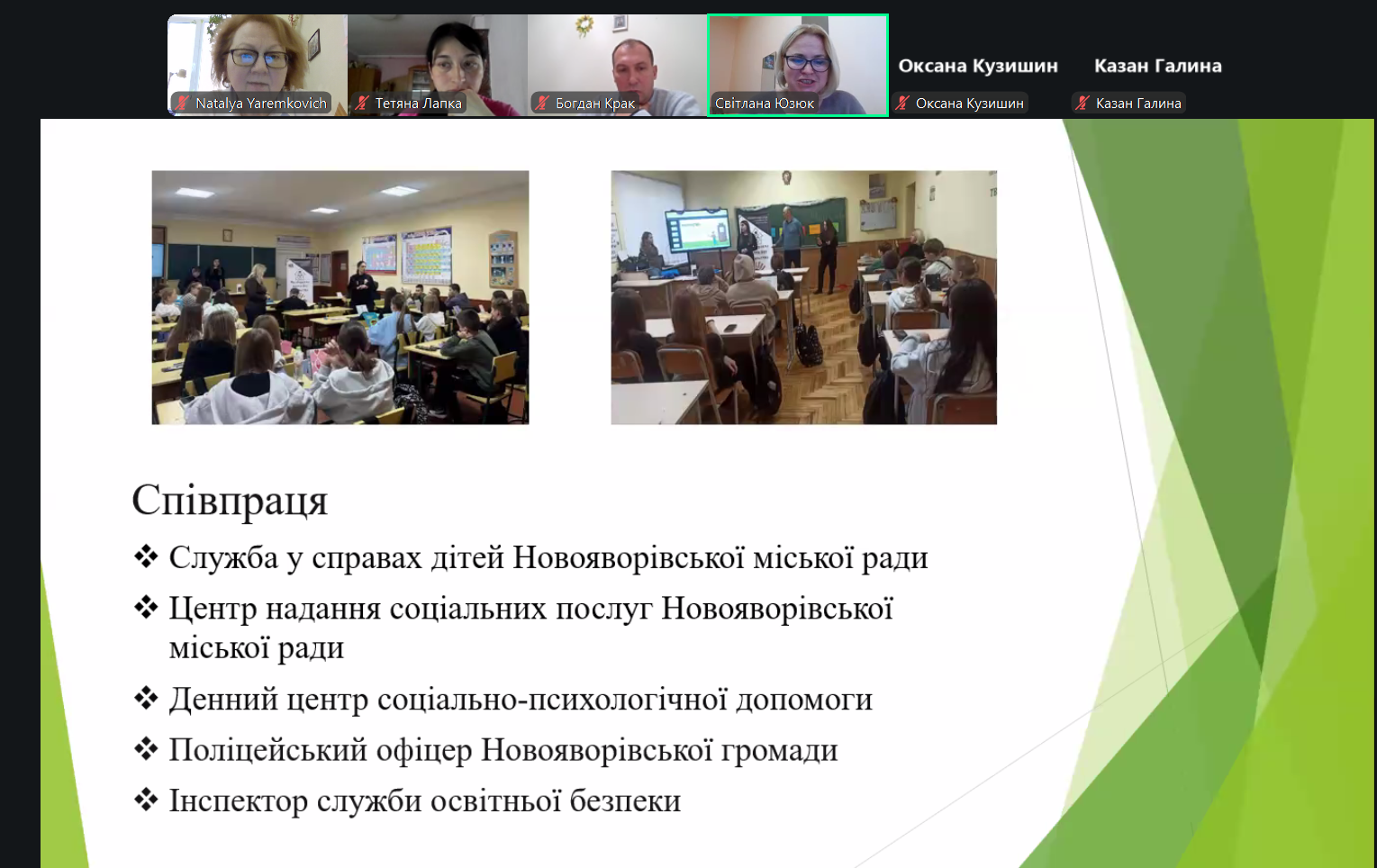 Про заходи, реалізовані в межах кампанії у своєму закладі, розповіла Світлана Юзюк, соціальний педагог Новояворівського ЗЗСО І–ІІІ ступенів № 3. Зокрема, йшлося про проведення класних годин, лекцій і бесід щодо різних видів насильства, оновлення інформаційних стендів з контактами гарячих ліній та алгоритмами дій у кризових ситуаціях. Педагогиня також презентувала карткову гру «Коло безпеки», яка в доступному ігровому форматі знайомить учнів із темами виявлення насильства та шляхами захисту.
