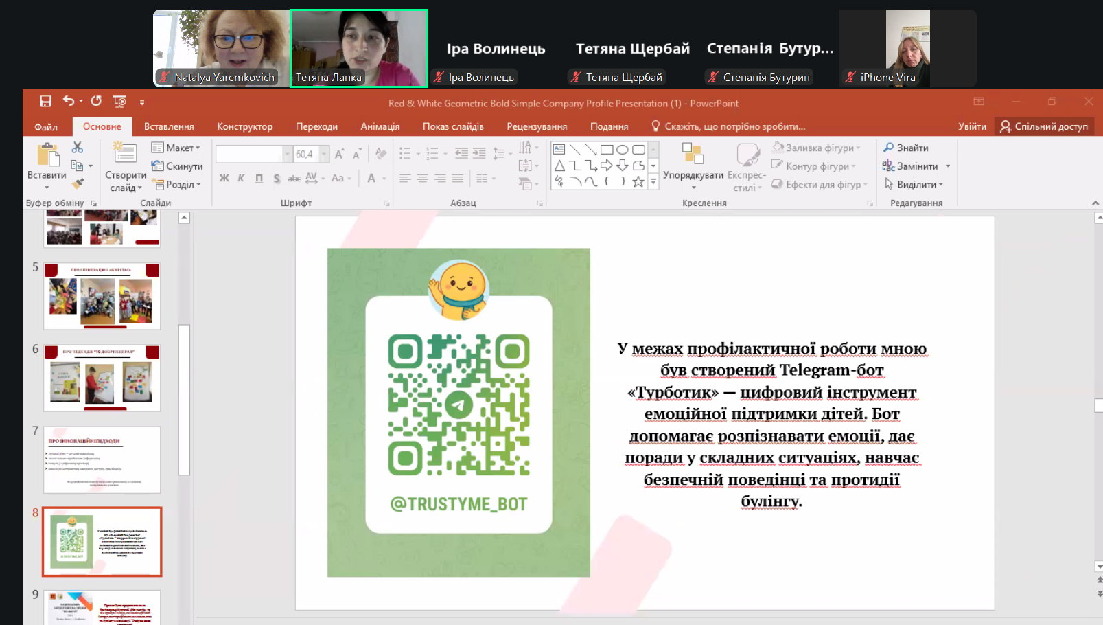 Авторка цифрового інструменту емоційної підтримки дітей «Турботик», соціальний педагог Глинського ЗЗСО Тетяна Лапка, ознайомила учасників із можливостями бота «Турботик», який допомагає дітям переживати булінг, страх чи сум: сприяє усвідомленню емоцій, дає змогу анонімно звернутися по допомогу, скласти особистий план безпеки та виконати прості заспокійливі вправи. Інструмент не замінює дорослих, але стає доступним і дружнім першим кроком до підтримки.