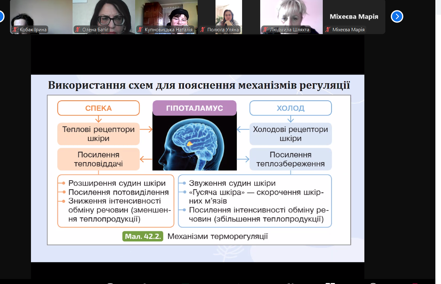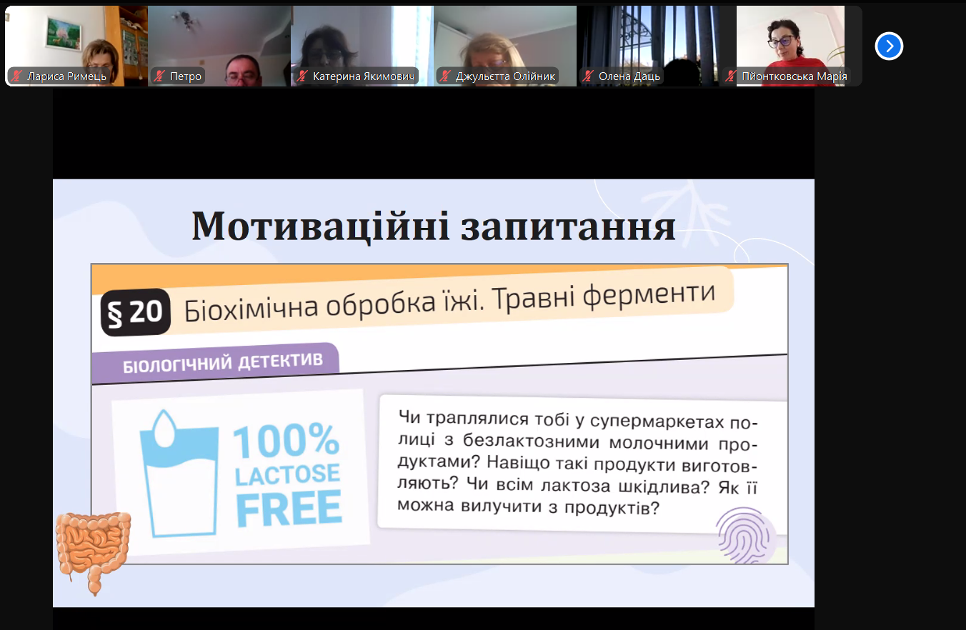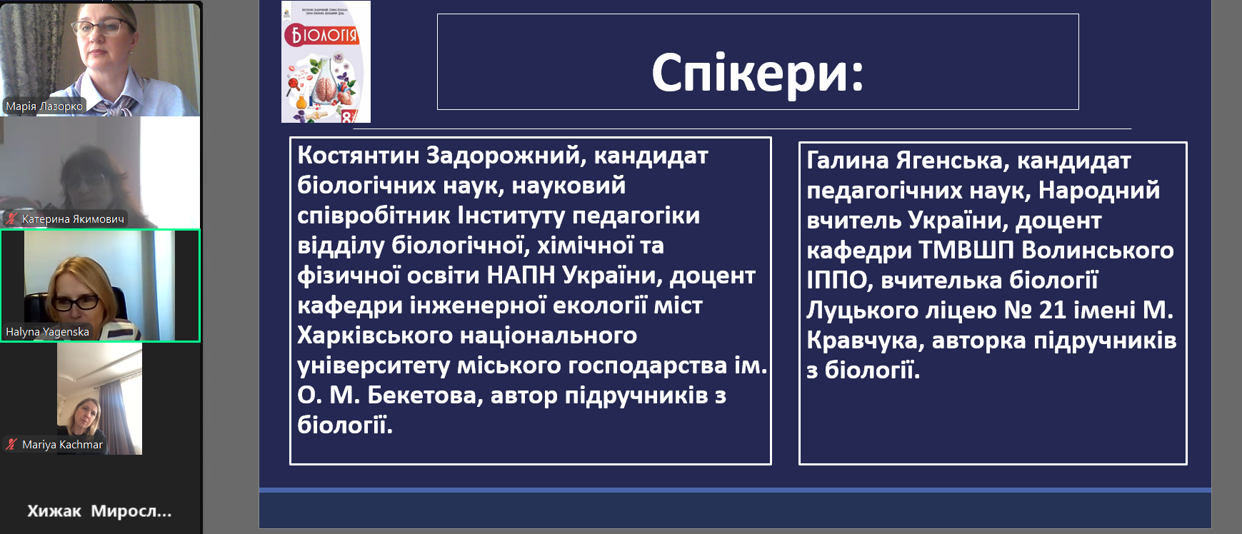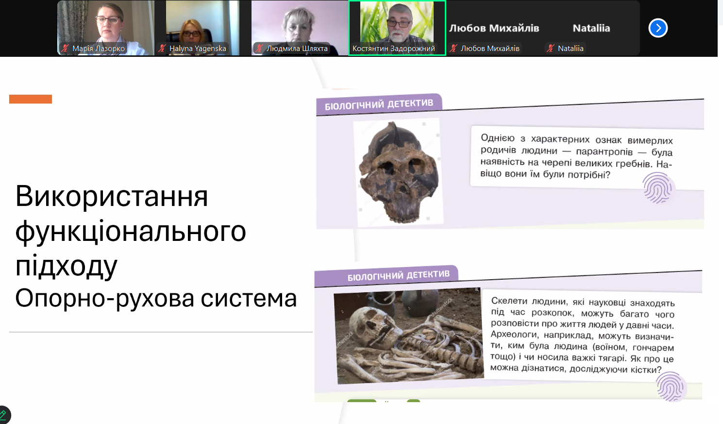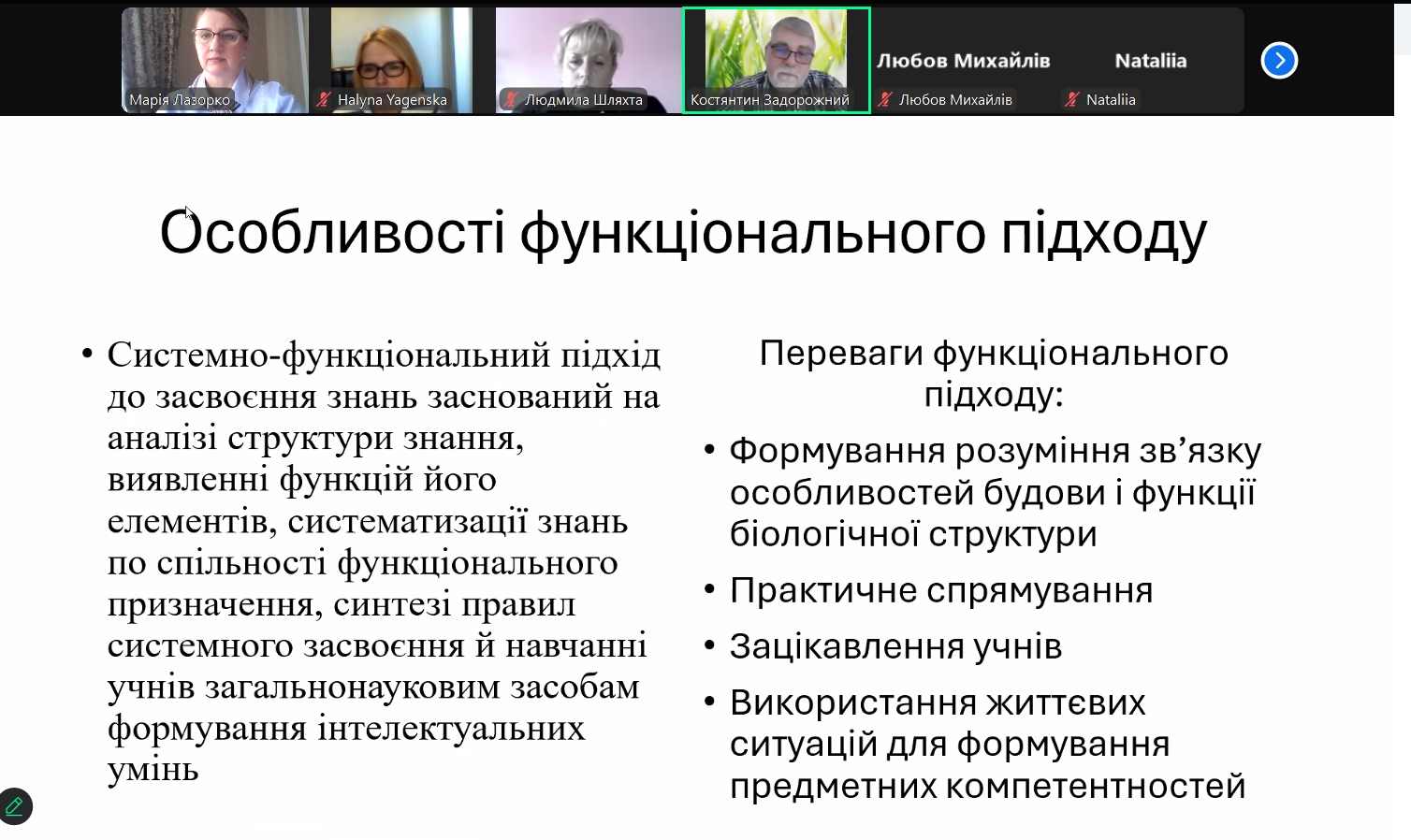 Галина Ягенська, кандидатка педагогічних наук, Народний вчитель України, доцентка кафедри теорії та методики викладання шкільних предметів Волинського інституту післядипломної педагогічної освіти, вчителька біології Луцького ліцею № 21 імені М. Кравчука, авторка підручників з біології, розкрила особливості функціонального підходу, його переваги та використання, продемонструвала використання схем, моделювання, науково-популярної літератури, мотиваційних питань до вивчення процесів та функцій людського організму, а також ознайомила з цікавими рубриками авторського підручника «Біологічний детектив», Тренуйся думати», «ТРЕНД»