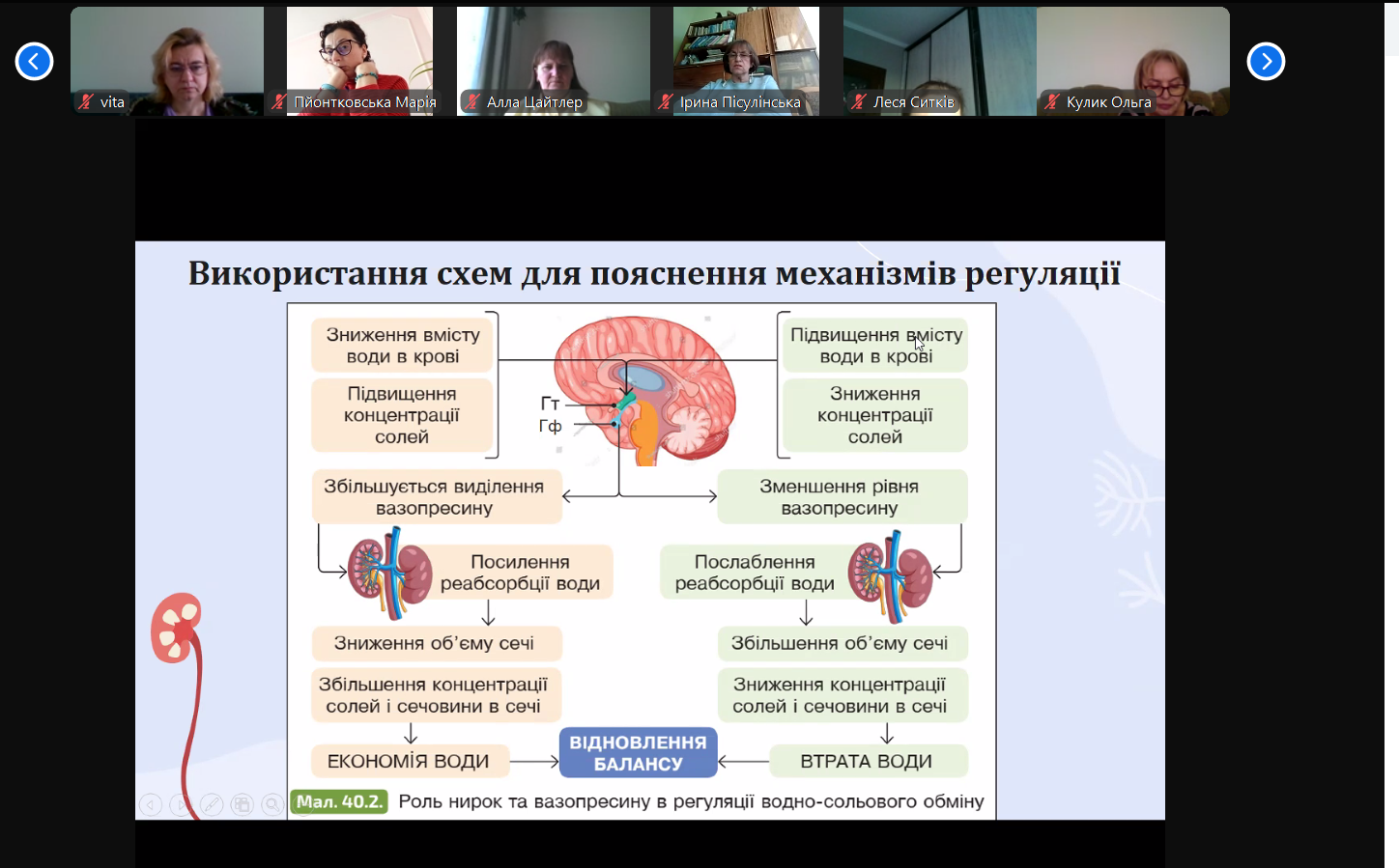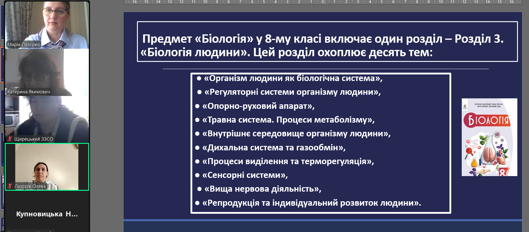 Марія Лазорко охарактеризувала структуру предмета біологія у 8 класі, особливості організації освітнього процесу, види навчальної діяльності відповідно до засад модельної програми курсу «Біологія» у 8 класі, проілюструвала застосування діяльнісного підходу в реалізації навчання на уроці біології у 8 класі НУШ. Вона зазначила, що якісні підручники – це одна із запорук ефективного навчання та успіху учнів.