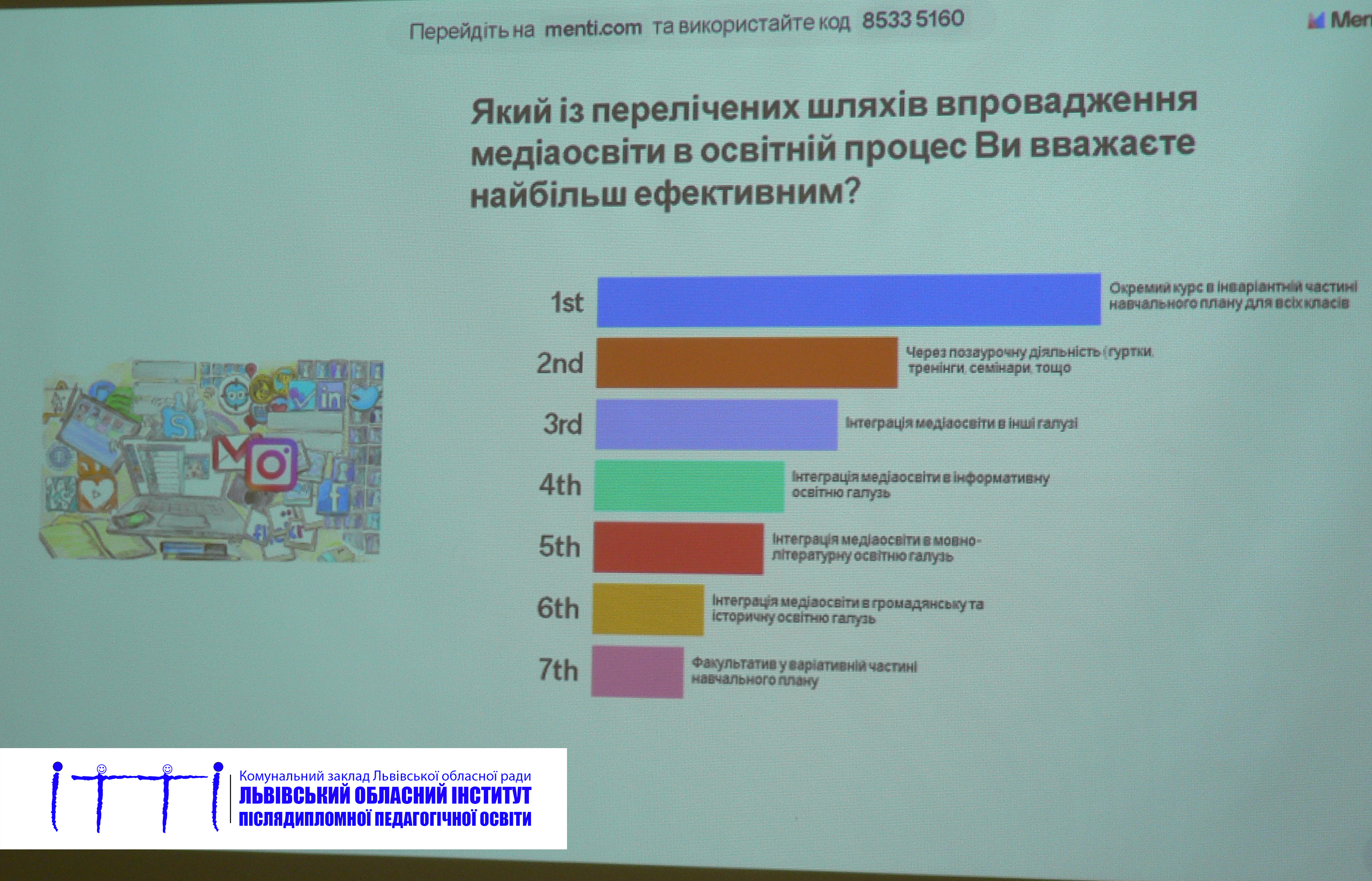 На завершення конференції було проведено опитування про найефективніші шляхи інтеграції медіаграмотності в освітній процес. З результатами опитування ознайомила Ольга Якимик, методистка кабінету «Центр внутрішнього забезпечення якості освіти» КЗ ЛОР ЛОІППО. Більшість учасників конференції підтримали ідею запровадження окремого курсу медіаграмотності у всіх класах.