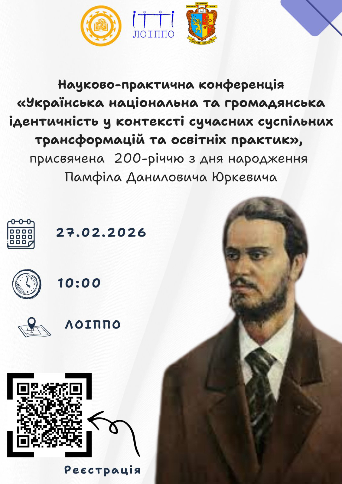 Факультет педагогічної освіти Львівського національного університету імені Івана Франка, департамент освіти та науки Львівської обласної державної адміністрації, КЗ ЛОР «Львівський обласний інститут післядипломної педагогічної освіти» запрошують науковців і педагогів-практиків до участі в науково-практичній конференції «Українська національна та громадянська ідентичність у контексті сучасних суспільних трансформацій та освітніх практик», присвяченій 200-річчю з дня народження Памфіла Даниловича Юркевича.